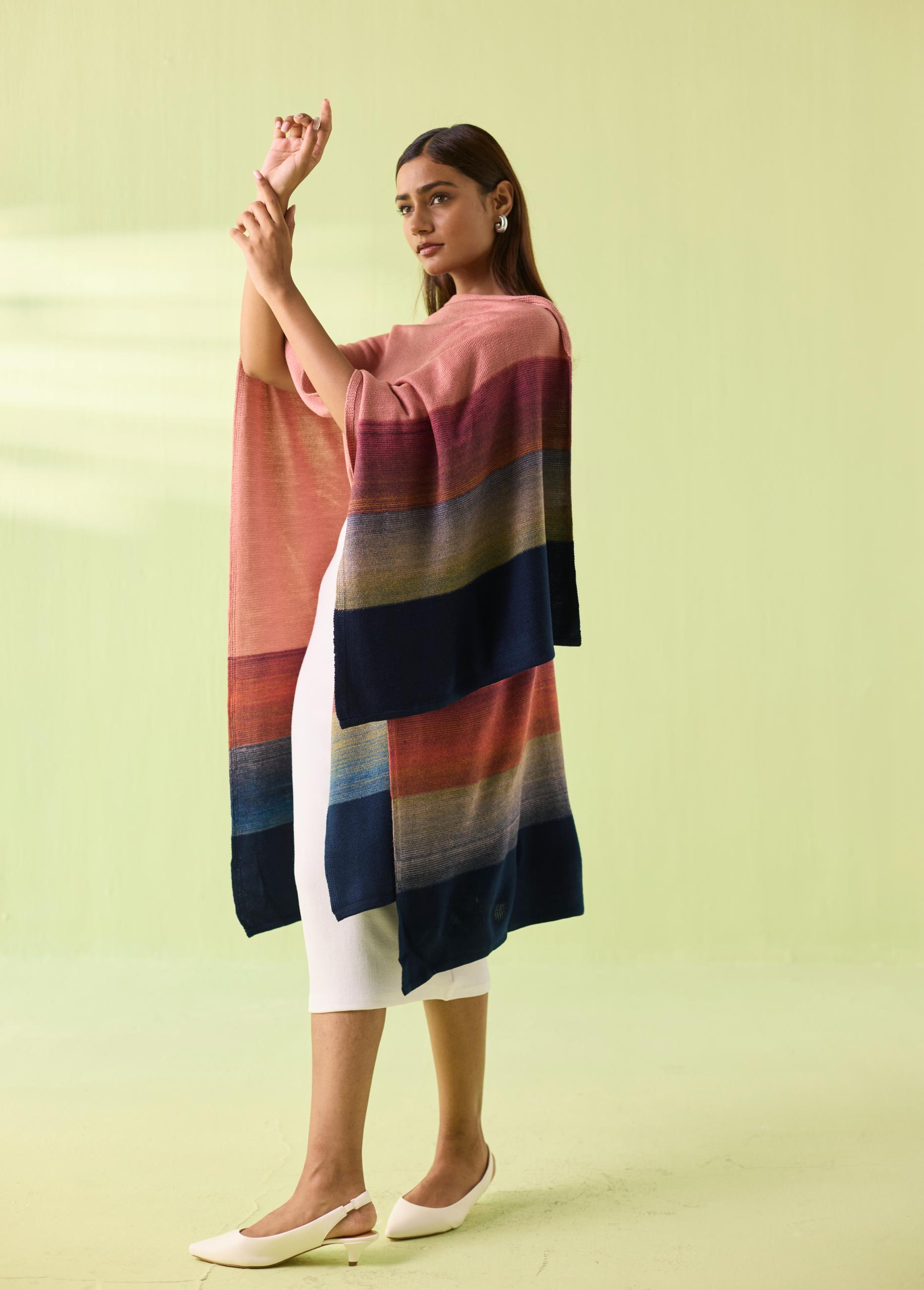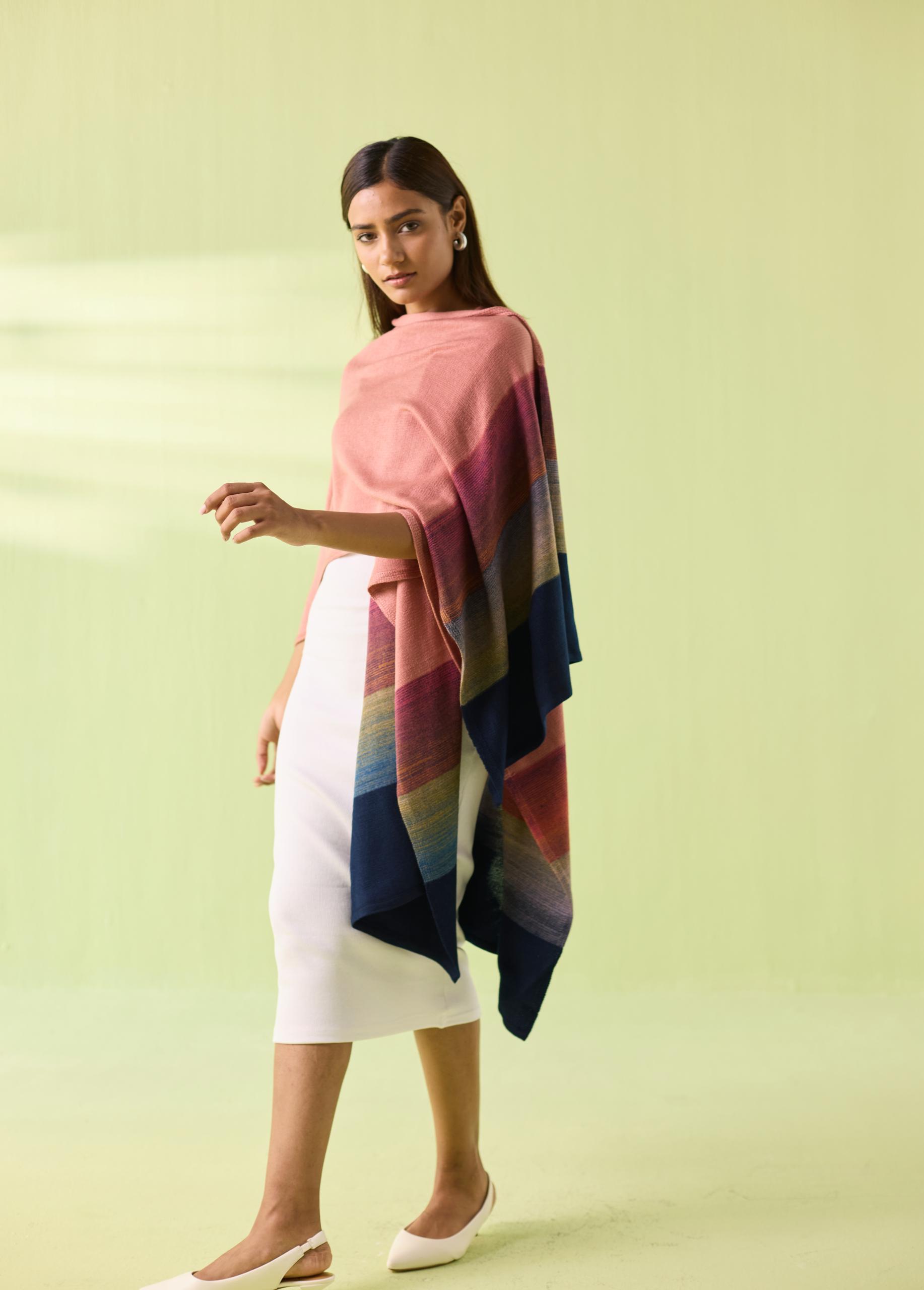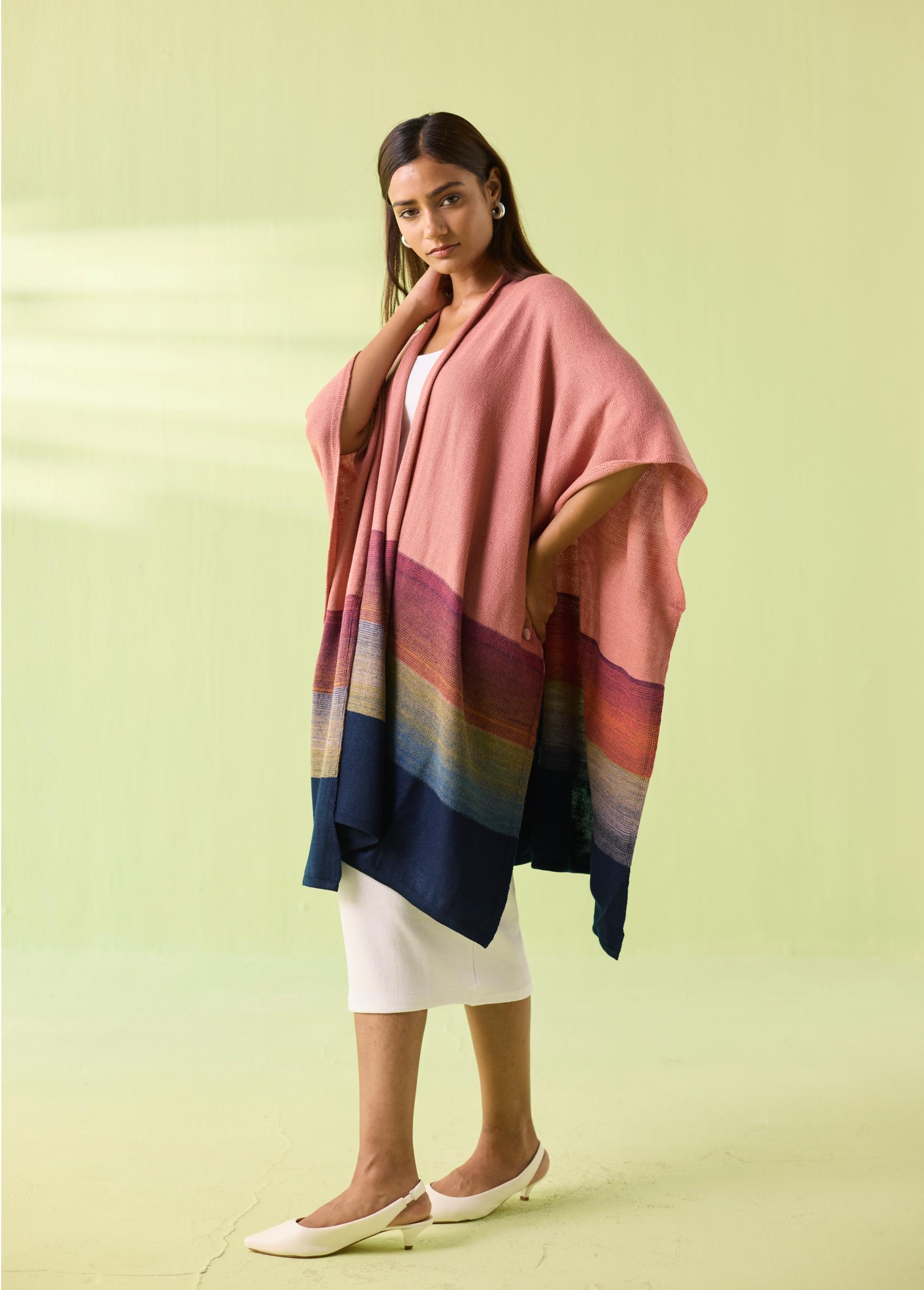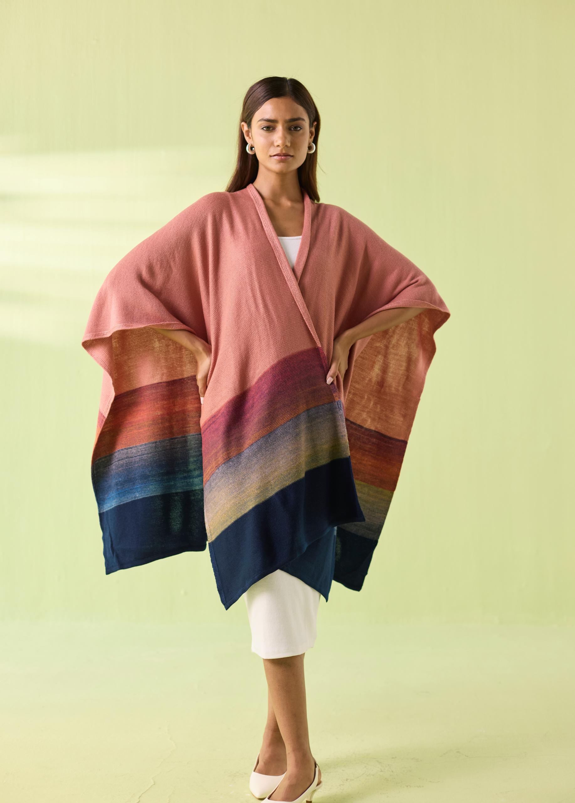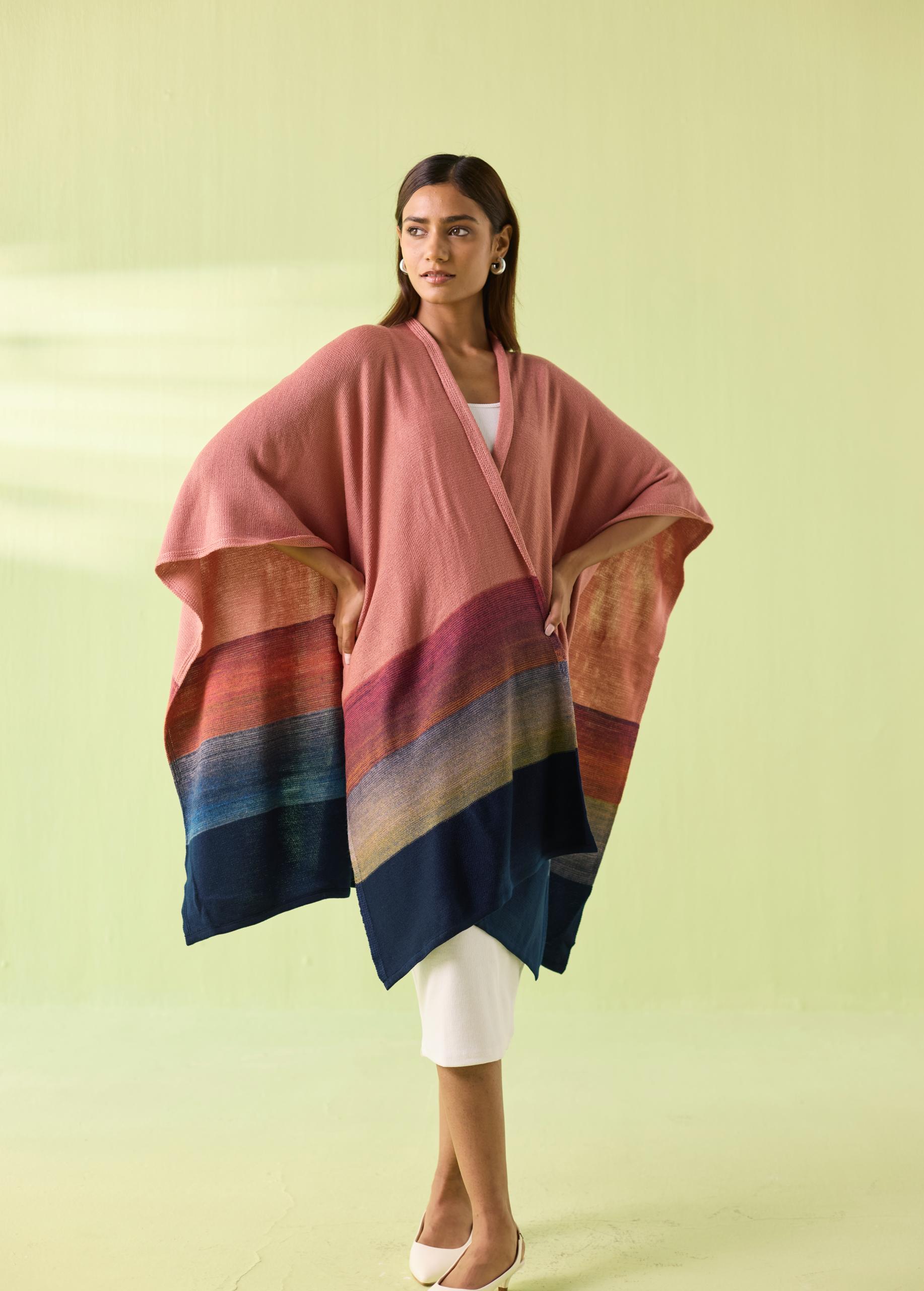 A soft blend of elegance and comfort, the Blush Horizon Woollen Poncho wraps you in warmth while adding effortless sophistication to your winter wardrobe. Designed in soothing blush tones with a beautifully graded multicolour border, this flowy silhouette drapes naturally—perfect for layering over dresses, tops, or winter basics. A signature Neeti S Sud piece crafted for modern, mindful style