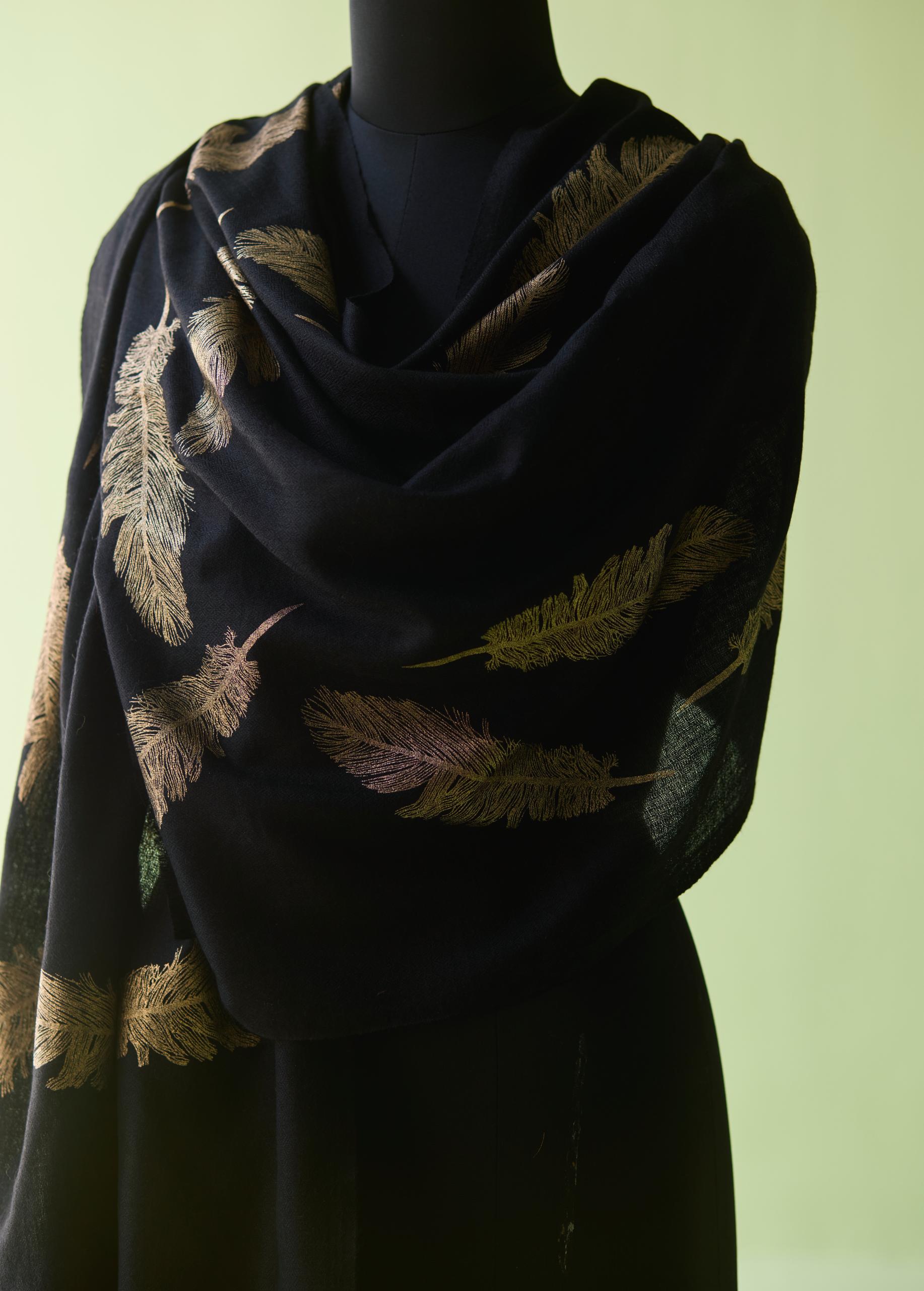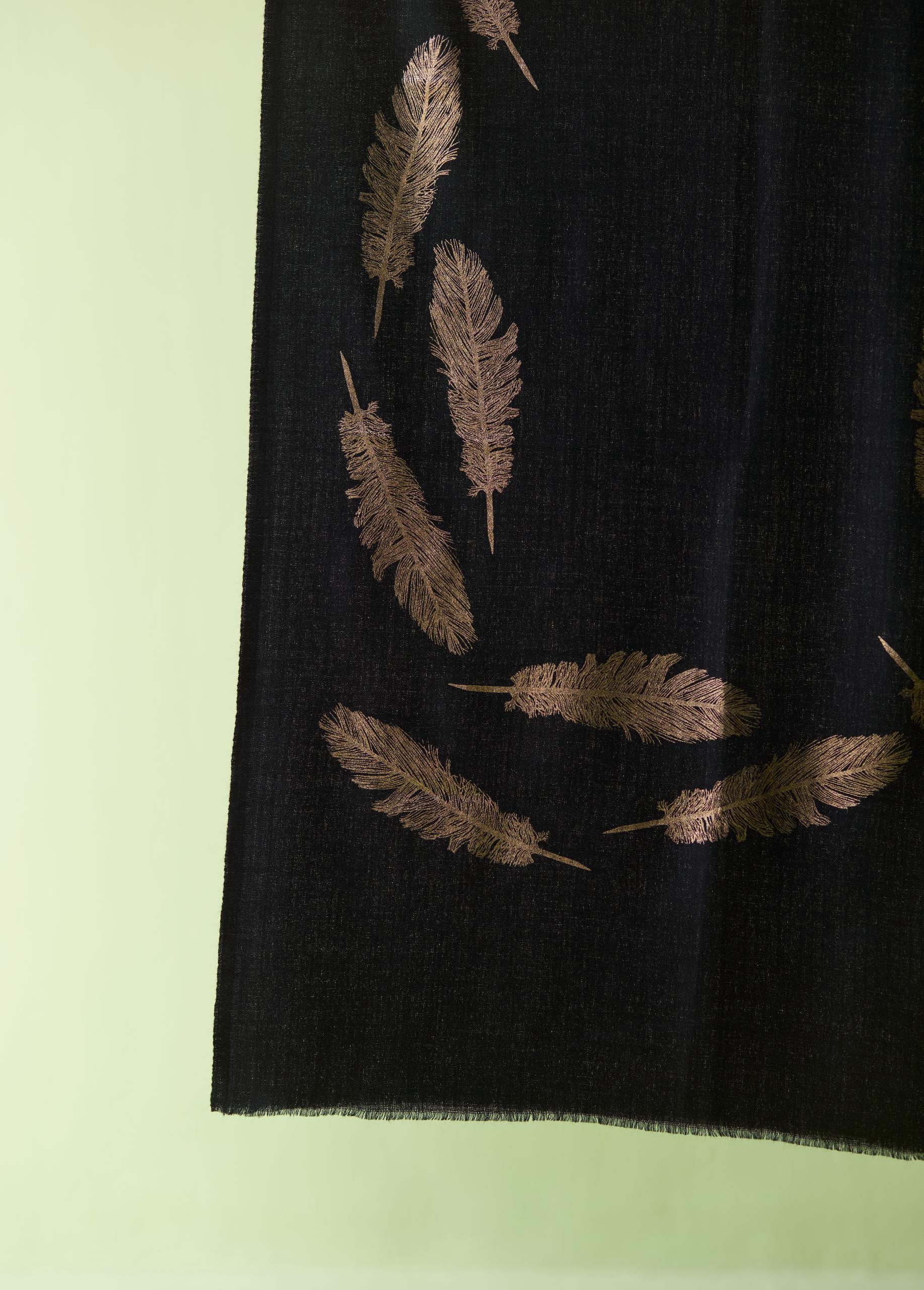The Midnight Feather Fine Wool Stole blends luxurious softness with bold elegance. Crafted in premium fine wool, it features exquisitely embroidered metallic feather motifs that shimmer beautifully against a deep black base. Sophisticated, lightweight, and statement-making — perfect for evening wear, festive occasions, or elevating any winter ensemble with effortless glamour.