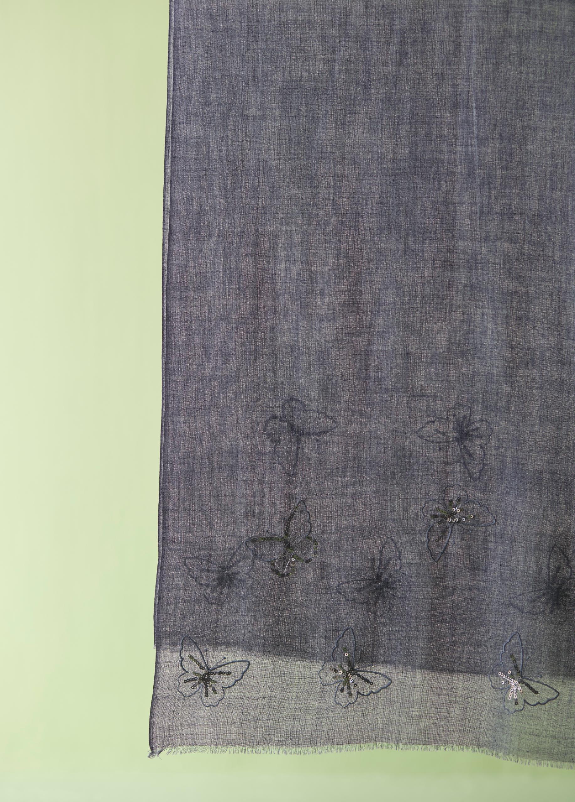 Elegant, soft, and delicately detailed — the Grey Butterfly Fine Wool Stole blends understated luxury with playful charm. Crafted from premium fine wool, it features subtle butterfly motifs highlighted with gentle sequin work that adds a quiet sparkle. The cool grey tone makes it versatile for day-to-evening styling while keeping your look polished and refined.