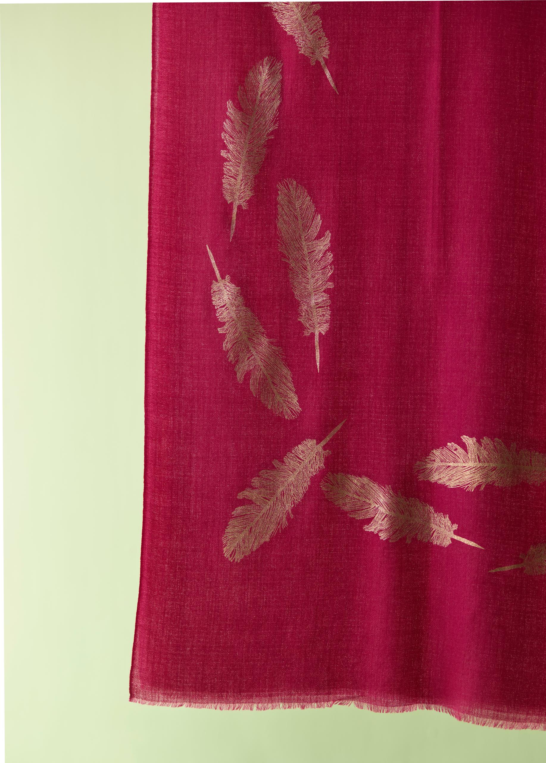 The Berry Gold Feather Fine Wool Stole is a statement piece that blends luxury with effortless charm. Crafted in ultra-soft fine wool, it features beautifully detailed gold feather motifs that shimmer delicately against a rich berry-pink base. Light, warm, and striking — this stole elevates festive looks, evening outings, and winter elegance with a touch of golden artistry.