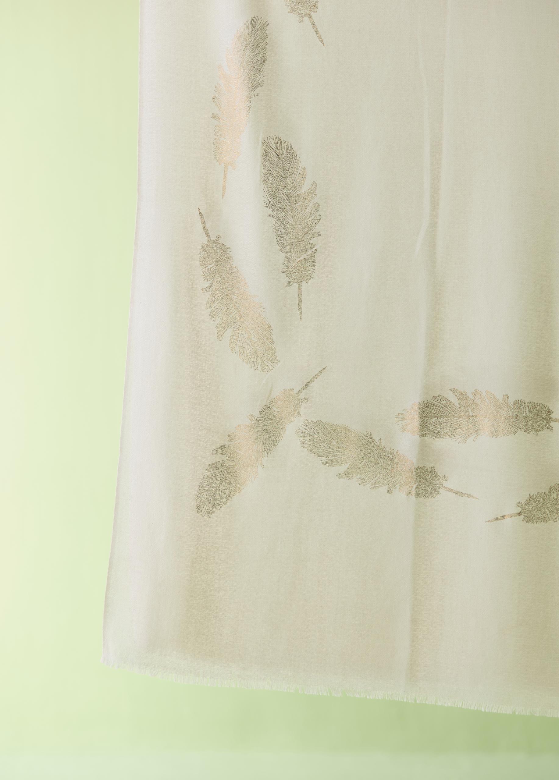 The Ivory Feather Fine Wool Stole is an elegant blend of softness and sophistication. Crafted in pure fine wool, it features delicate feather motifs in subtle gold tones that add a touch of shimmer to its serene ivory base. Lightweight, luxurious, and effortlessly graceful — perfect for festive occasions, evening wear, or elevating everyday style with quiet refinement.