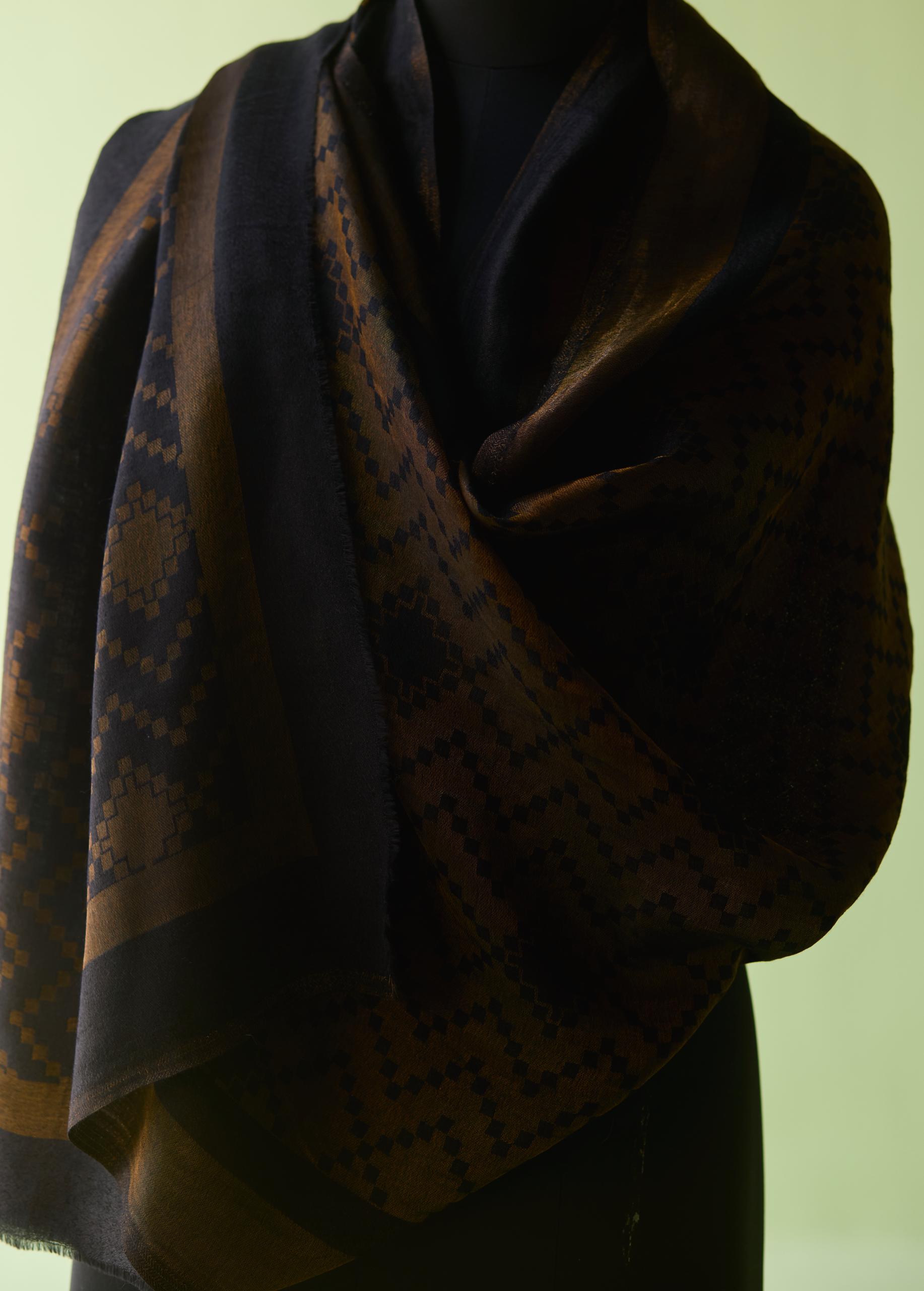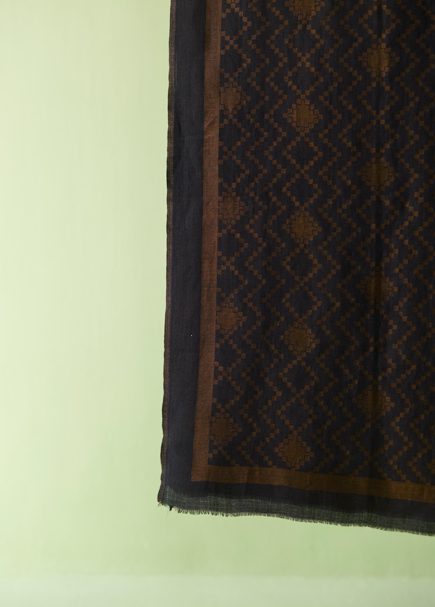 The Midnight Mosaic Fine Wool Stole blends rich brown–black tones with an intricate geometric self-zari pattern, creating a luxurious and artistic winter accessory. Crafted from ultra-soft fine wool, it offers elegant warmth and fluid drape, making it perfect for evening wear, festive dressing, and sophisticated everyday layering. A bold and timeless Neeti S Sud statement piece.