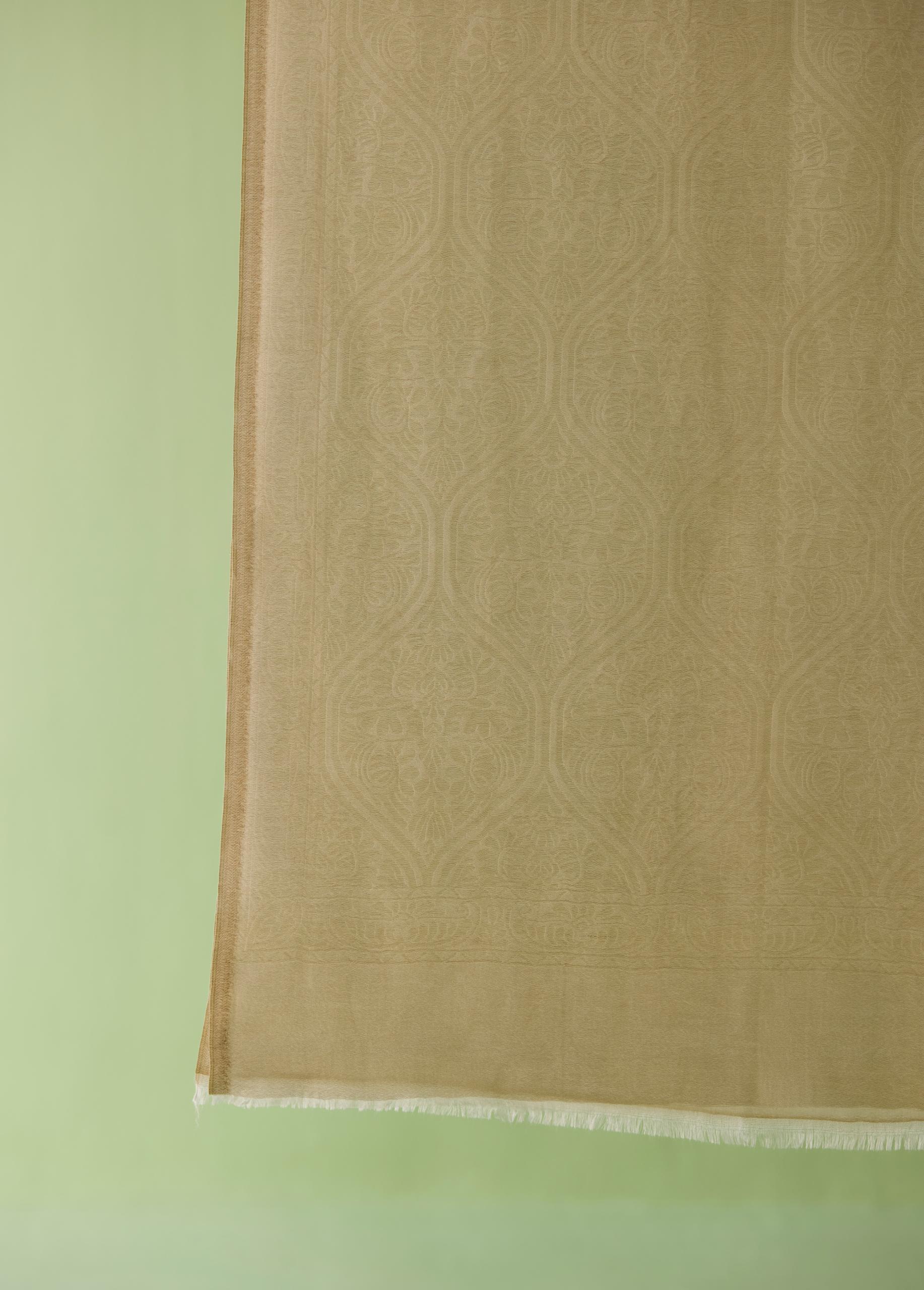 The Ivory Zari Motif Fine Wool Stole is a timeless piece crafted in ultra-soft fine wool, featuring delicate self-zari woven motifs that add quiet luxury to its soothing cream palette. Lightweight yet warm, this stole drapes effortlessly, making it perfect for festive wear, travel layering, or elevating everyday elegance. A serene and sophisticated Neeti S Sud classic.