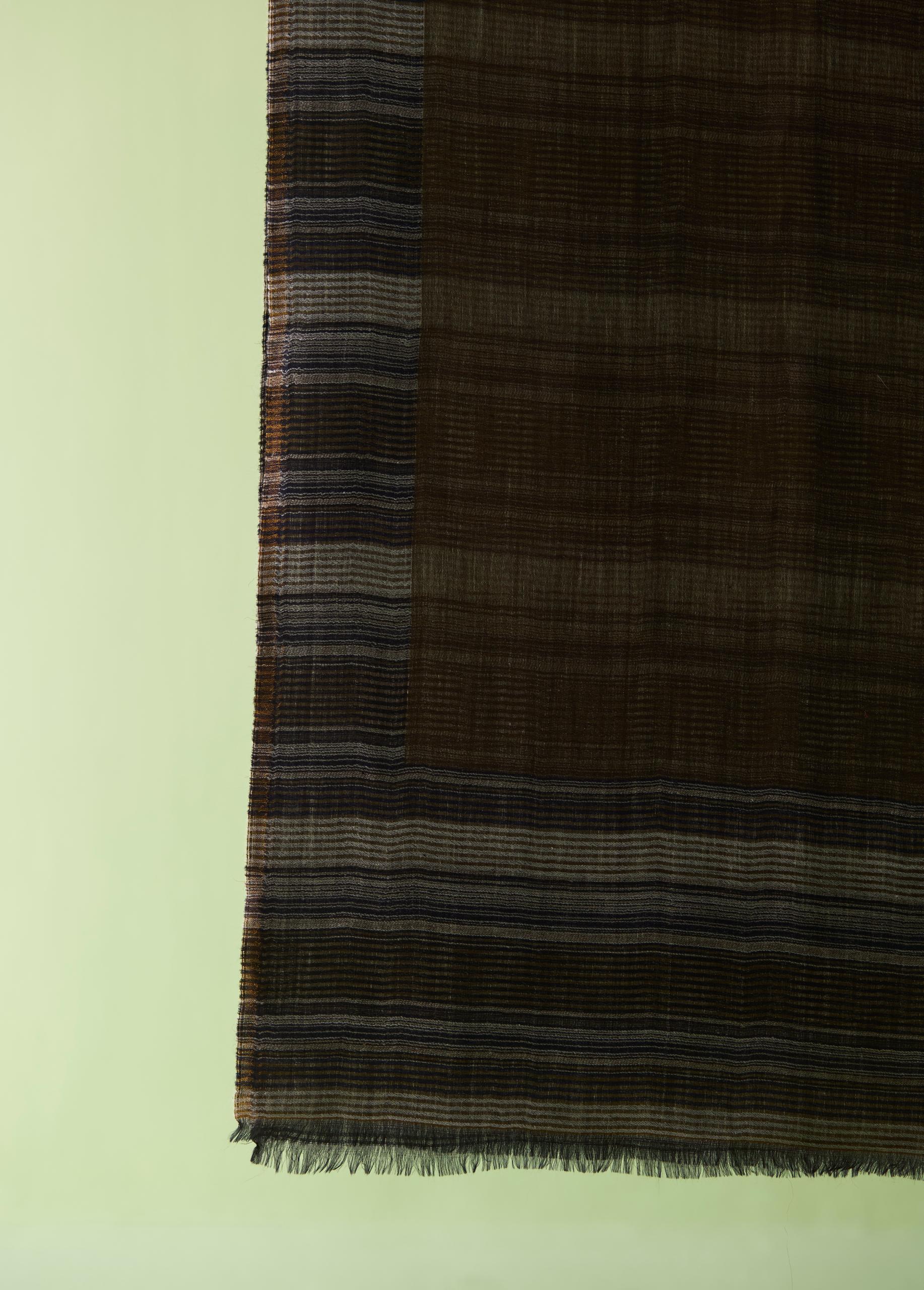 Rich, artistic, and beautifully textured—the Earthline Fine Wool Space-Dyed Stole blends deep coffee browns with charcoal and muted greys in a stunning space-dyed stripe design. Crafted from airy fine wool, it drapes fluidly while offering gentle warmth. Perfect for understated winter elegance, travel styling, or adding depth and character to everyday outfits. A distinctive Neeti S Sud classic.