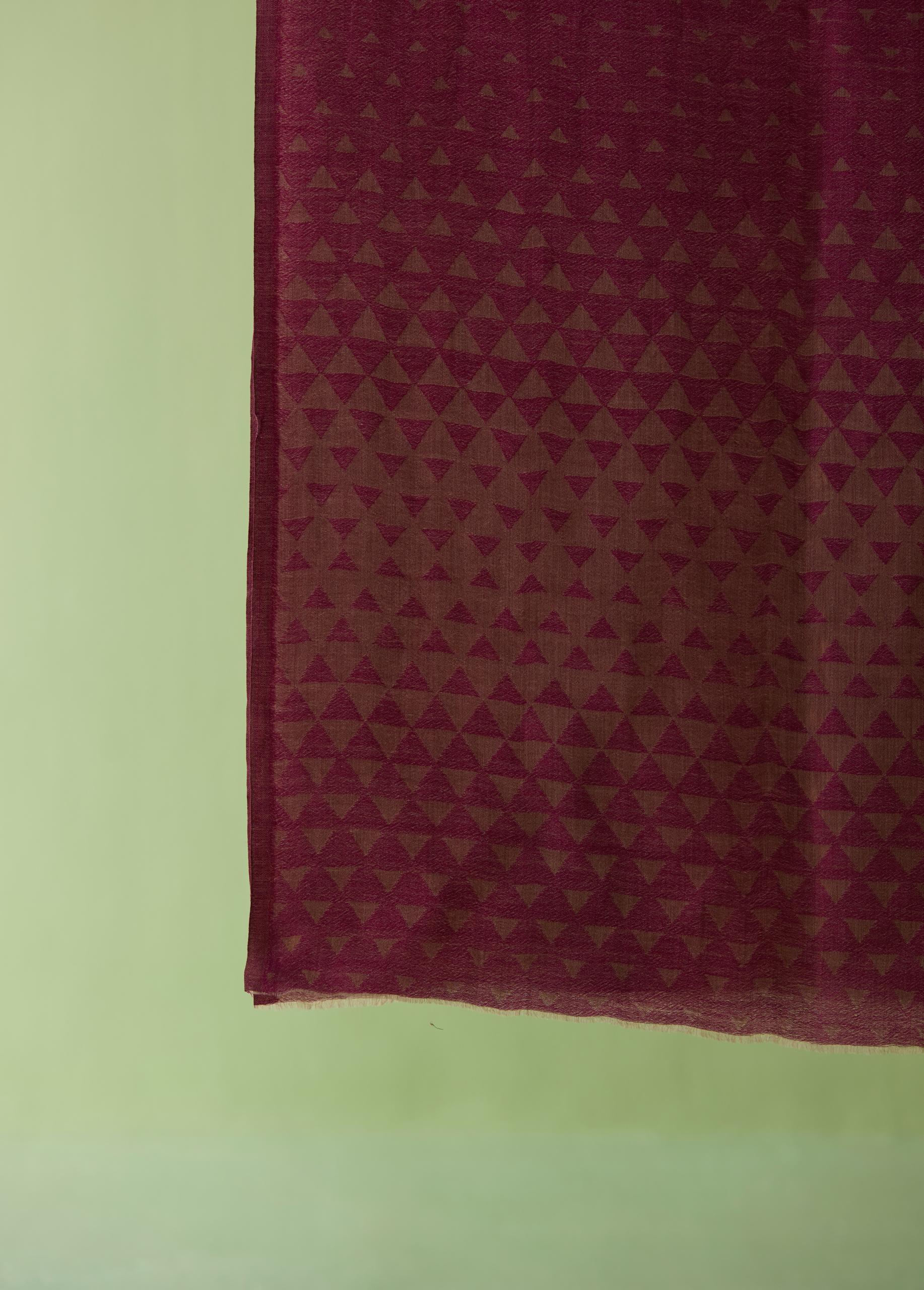 A rich blend of warmth and contemporary design, the Rosewood Pyramid Fine Wool Stole features an intricate geometric weave in deep maroon and soft rose-pink tones. Crafted from ultra-soft fine wool, it offers a fluid drape and gentle warmth, making it perfect for festive evenings, winter styling, or adding a pop of refined colour to everyday looks. A vibrant and timeless Neeti S Sud signature.