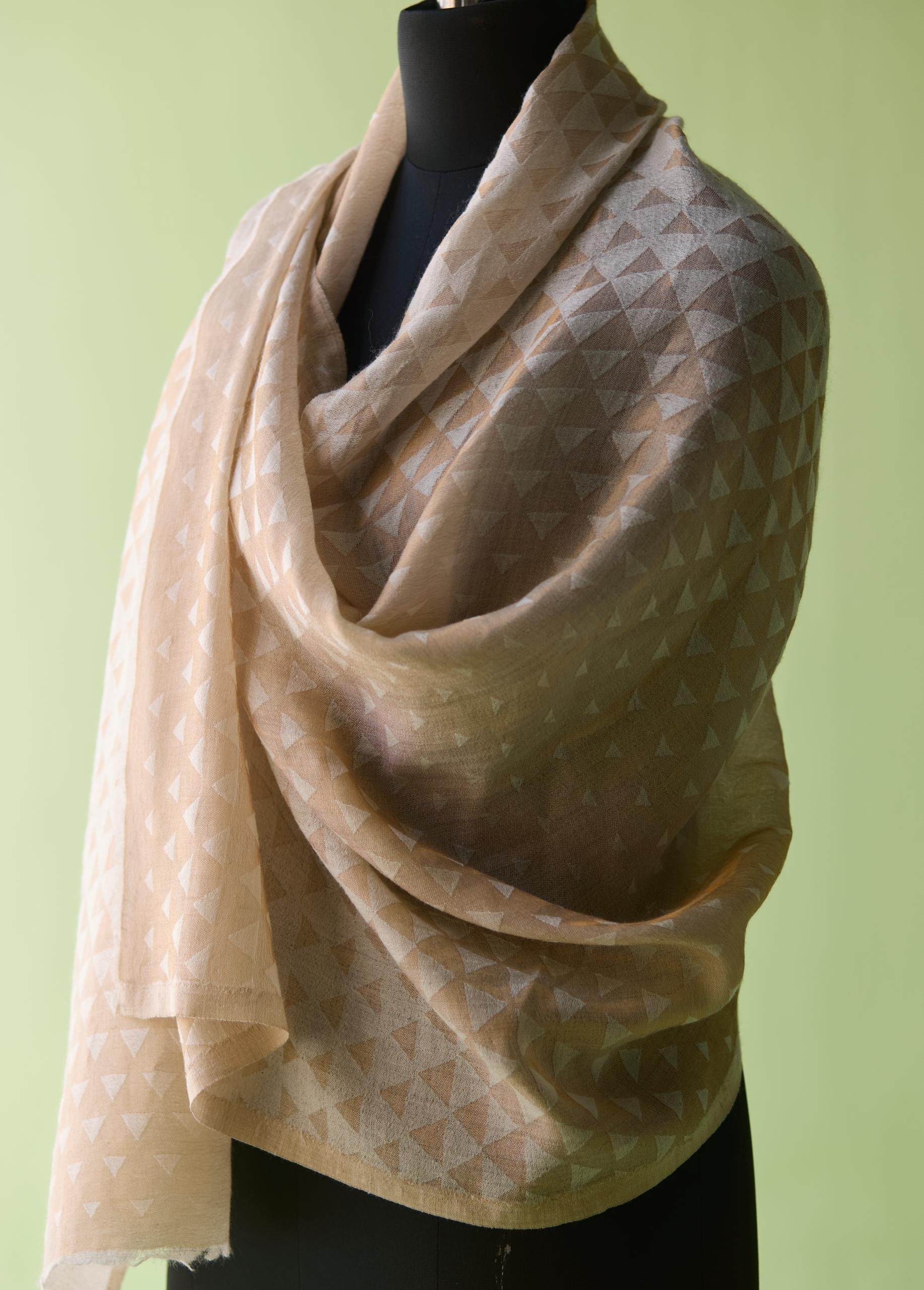 Soft, serene, and beautifully textured—the Ivory Pyramid Fine Wool Stole is crafted from premium fine wool and adorned with a subtle geometric weave. Its gentle cream base paired with tonal pyramid motifs makes it a versatile style companion for both everyday elegance and festive dressing. Lightweight yet warm, it drapes effortlessly—an understated and timeless Neeti S Sud essential.