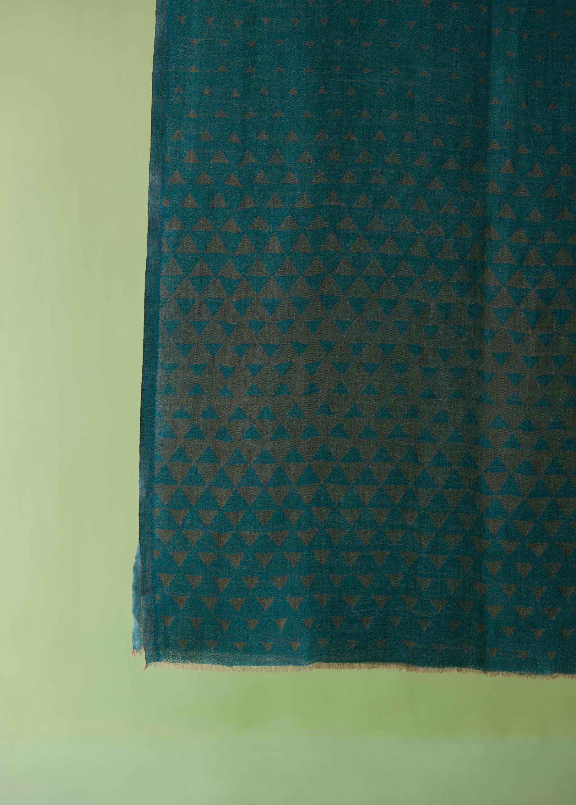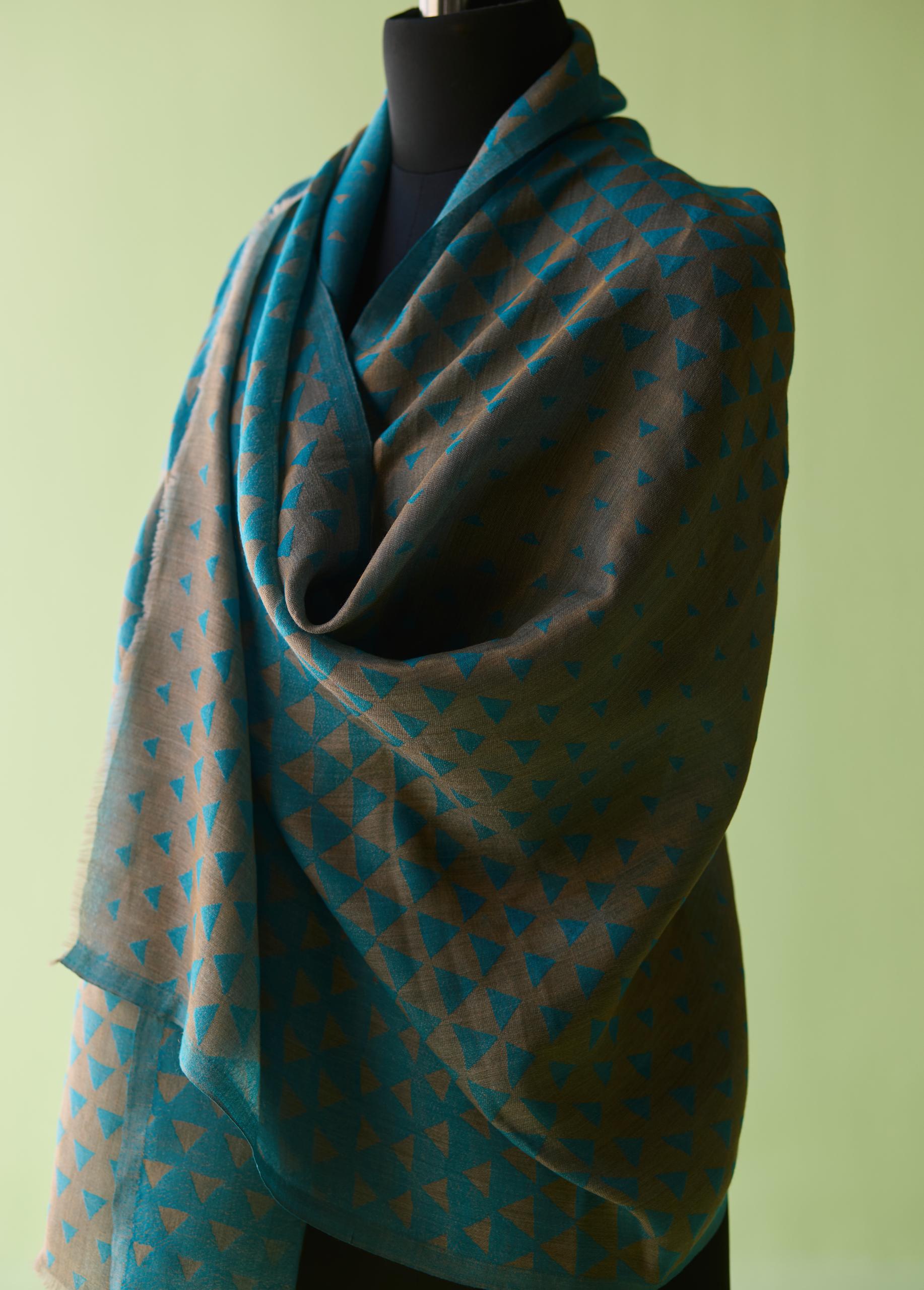 Bold yet refined, the Teal Pyramid Fine Wool Stole features an intricate geometric weave in earthy brown and rich teal tones. Crafted from premium fine wool, it offers a feather-light drape with gentle warmth, making it perfect for effortless everyday style or travel. The unique pyramid pattern adds a contemporary edge—an ideal Neeti S Sud piece for women who love statement elegance.