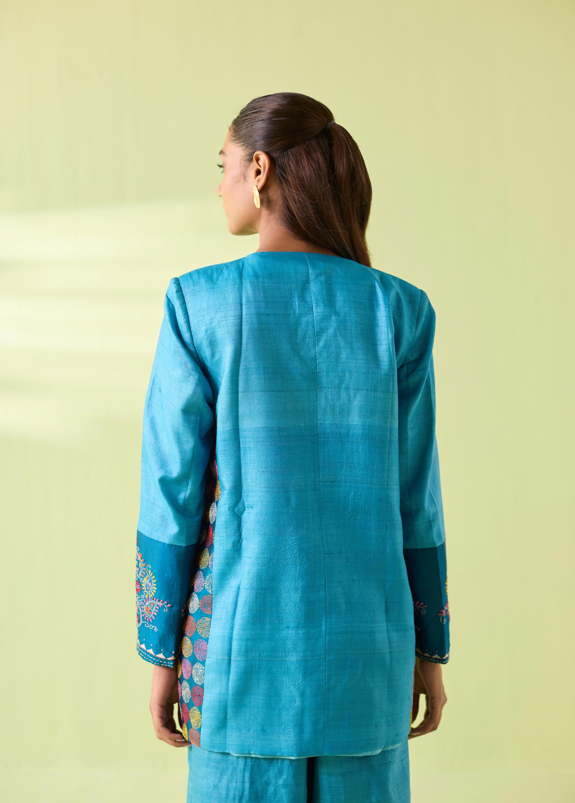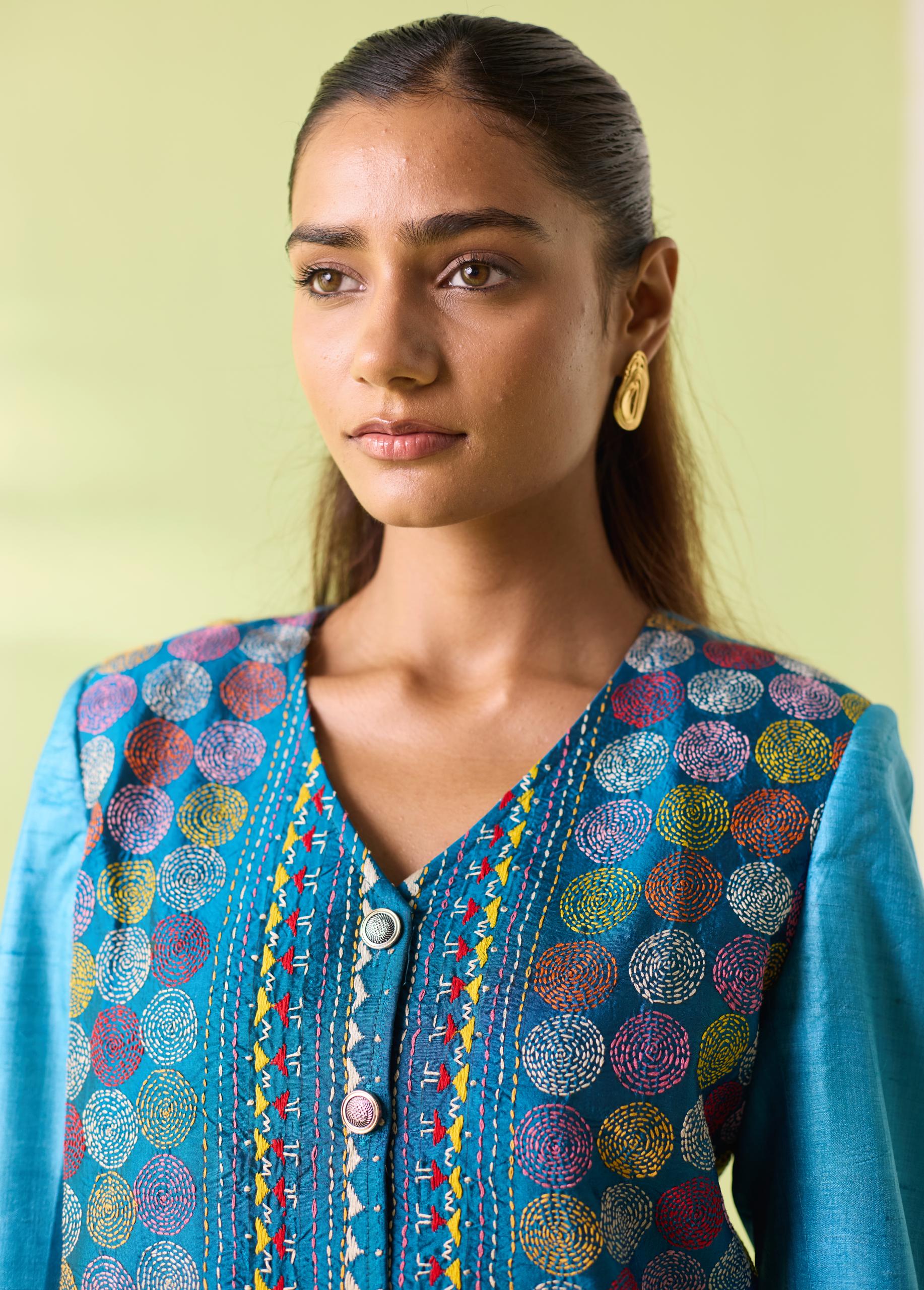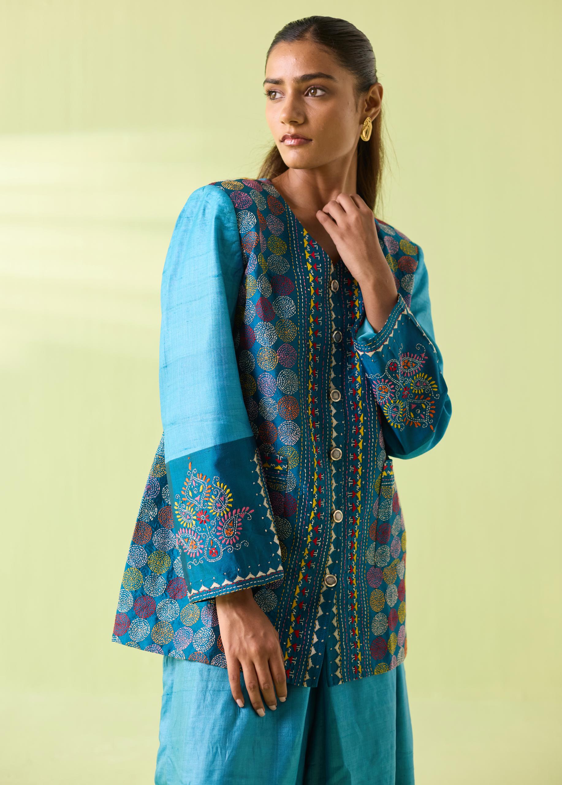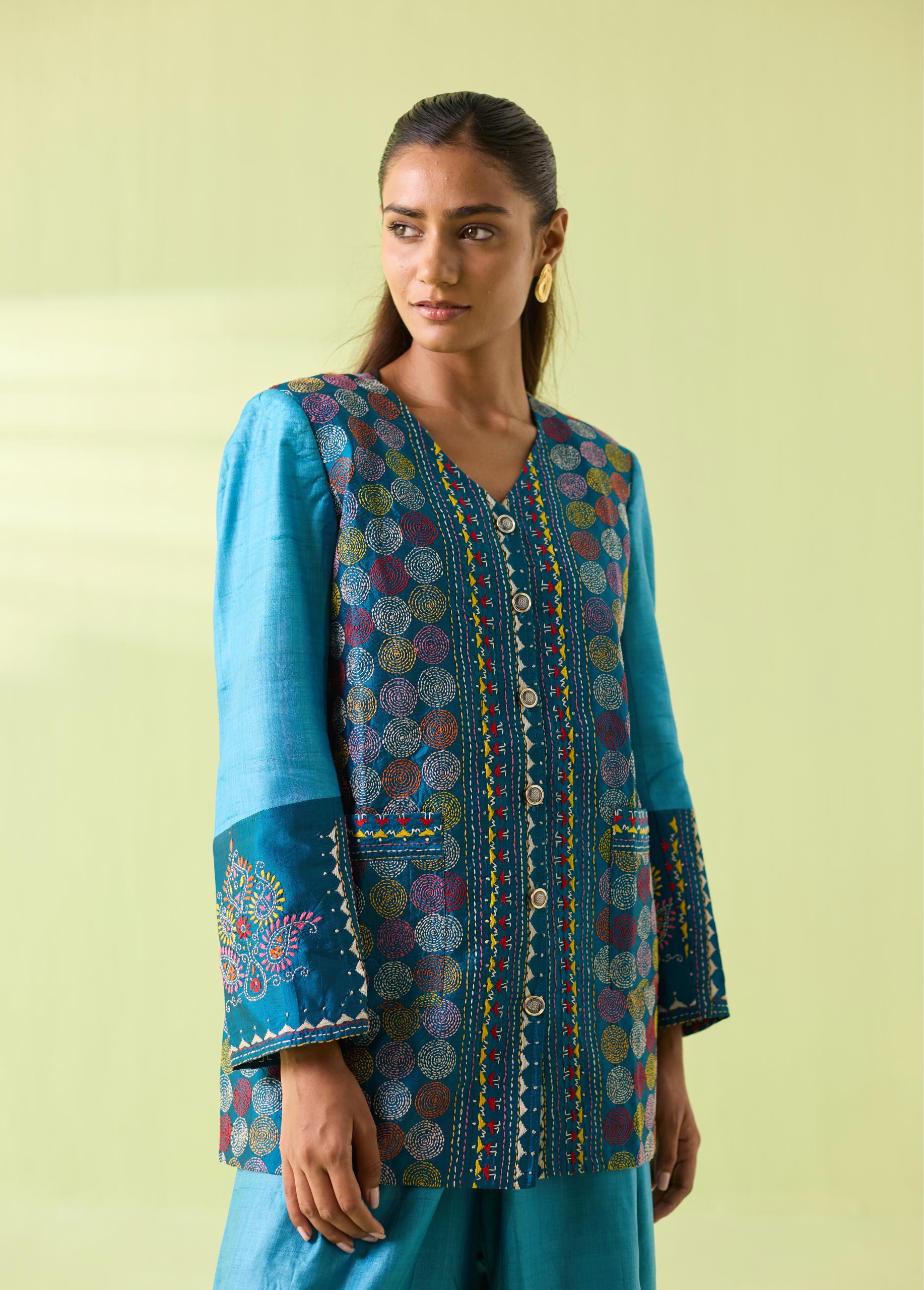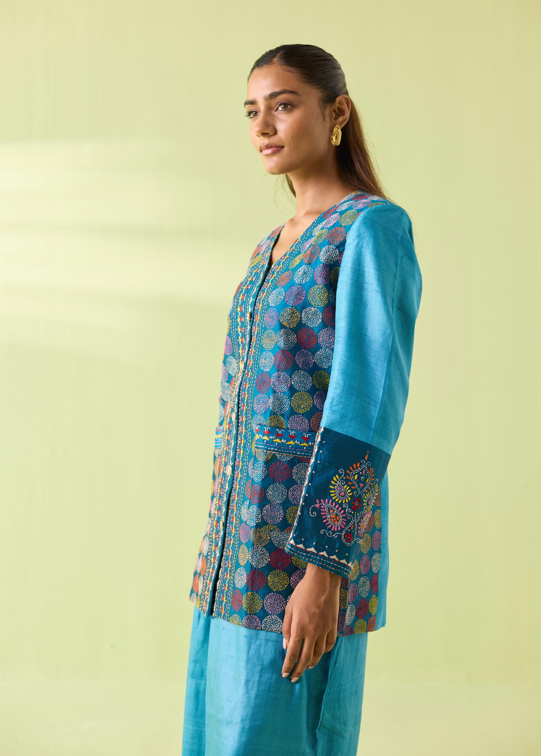 Teal Mosaic Hand-Embroidered Kosa Silk Jacket