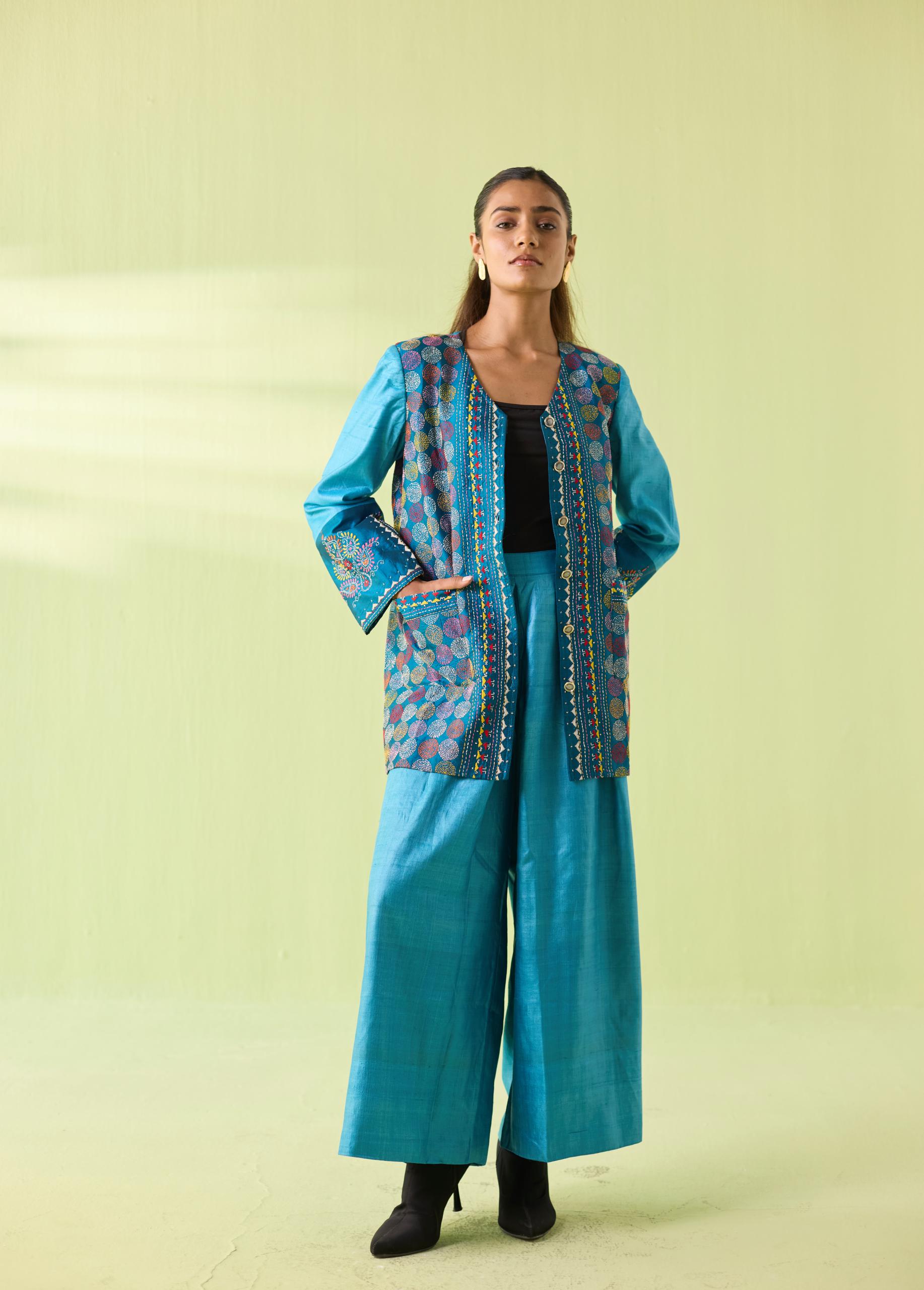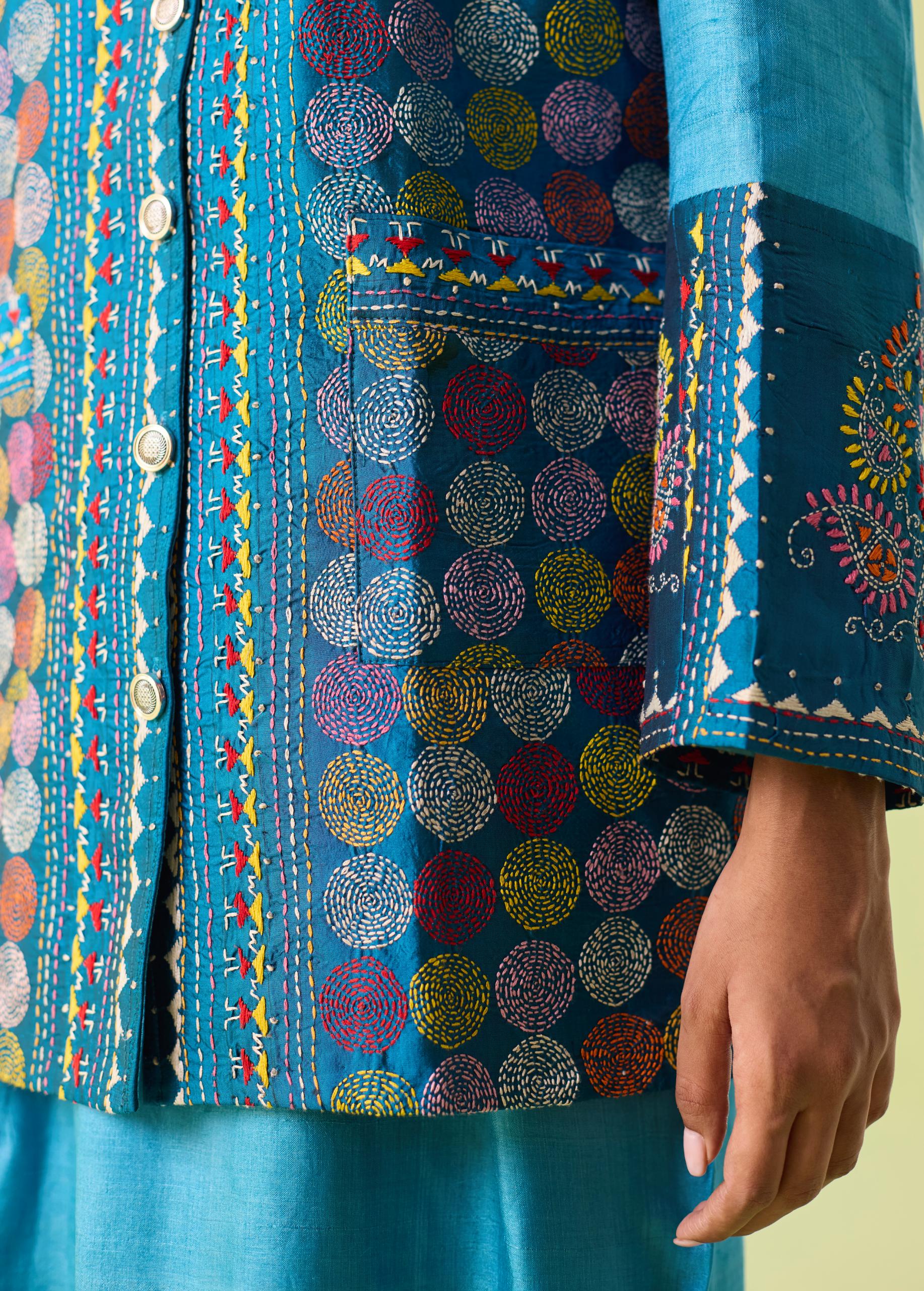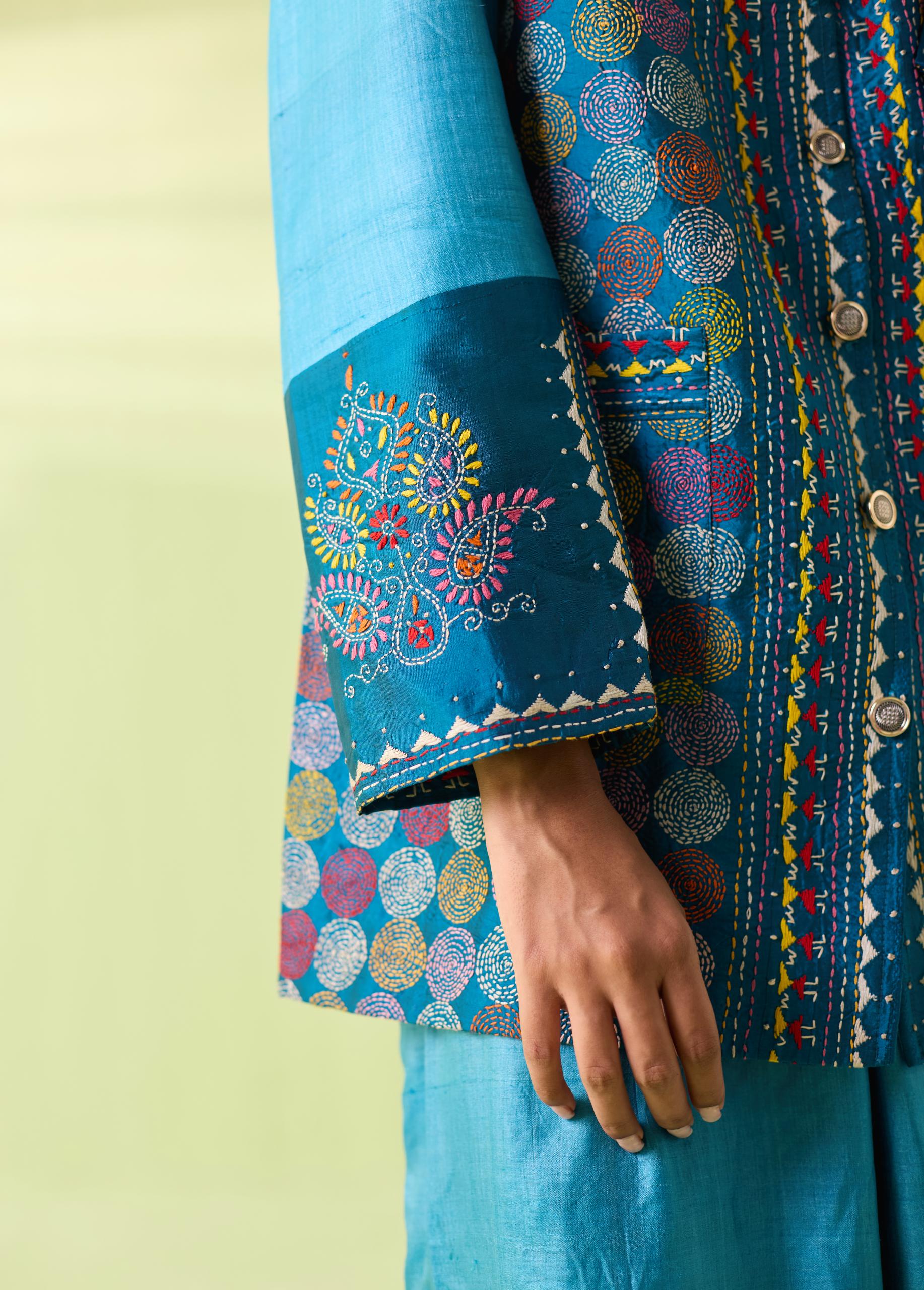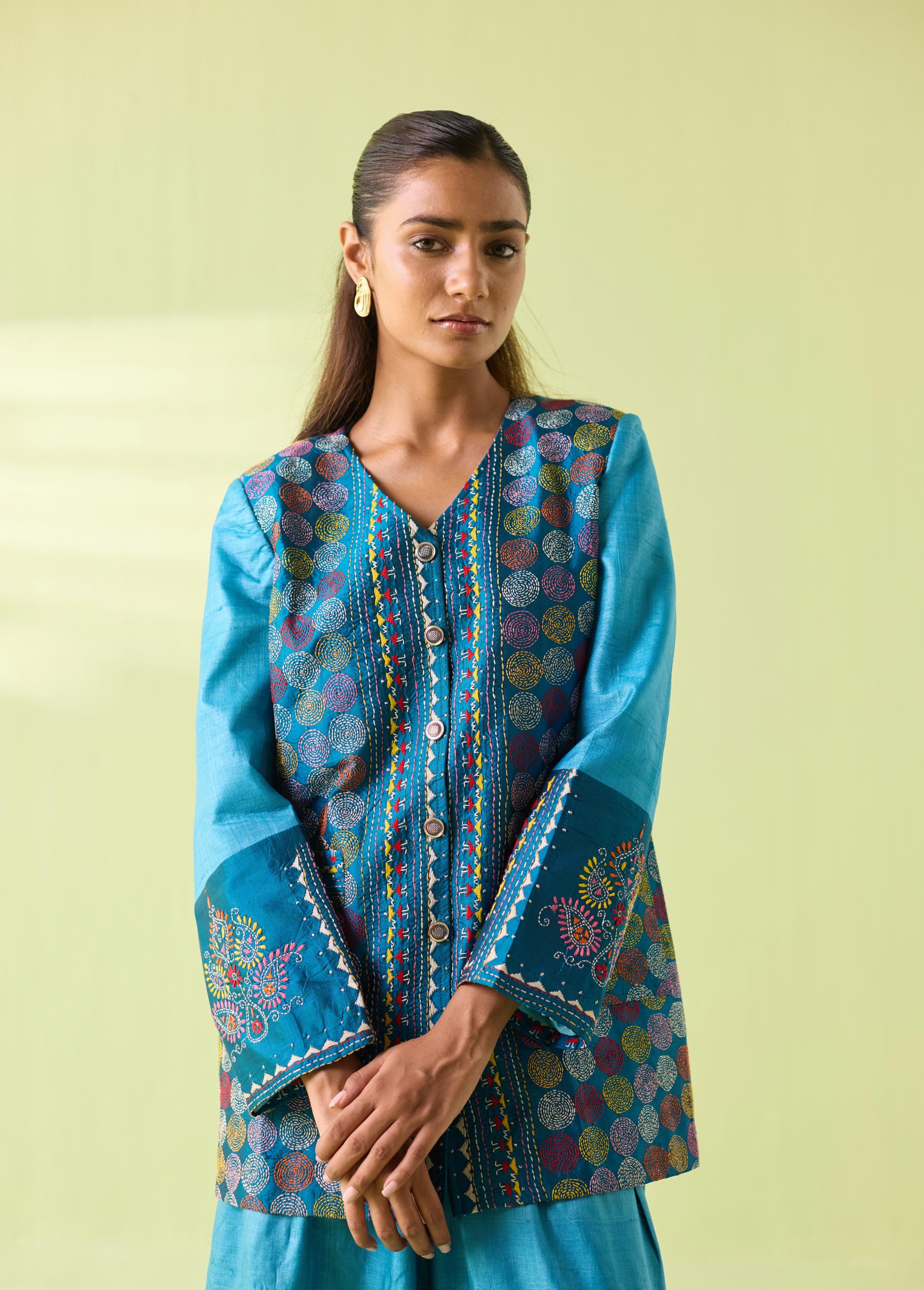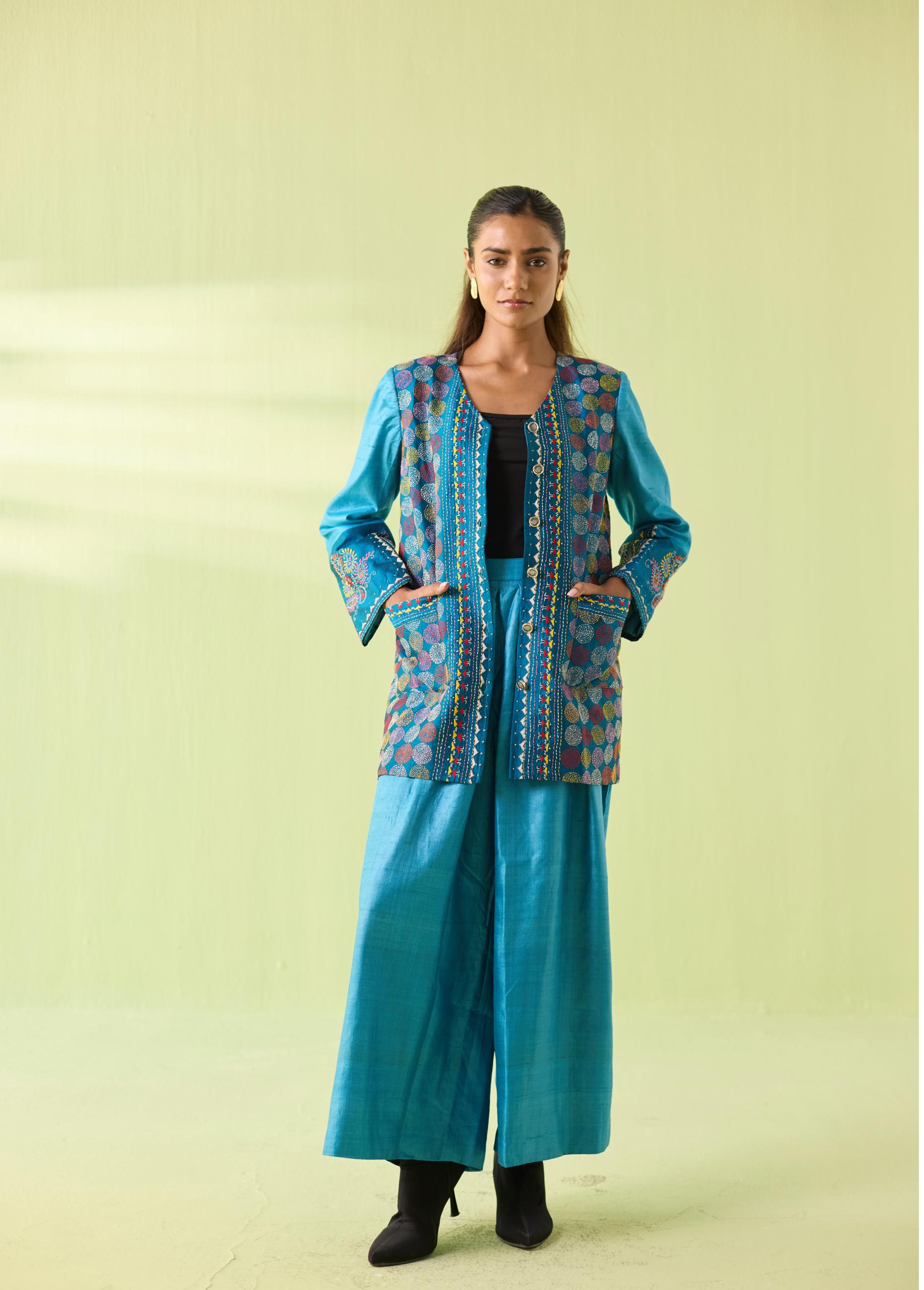 Teal Mosaic Hand-Embroidered Kosa Silk Jacket