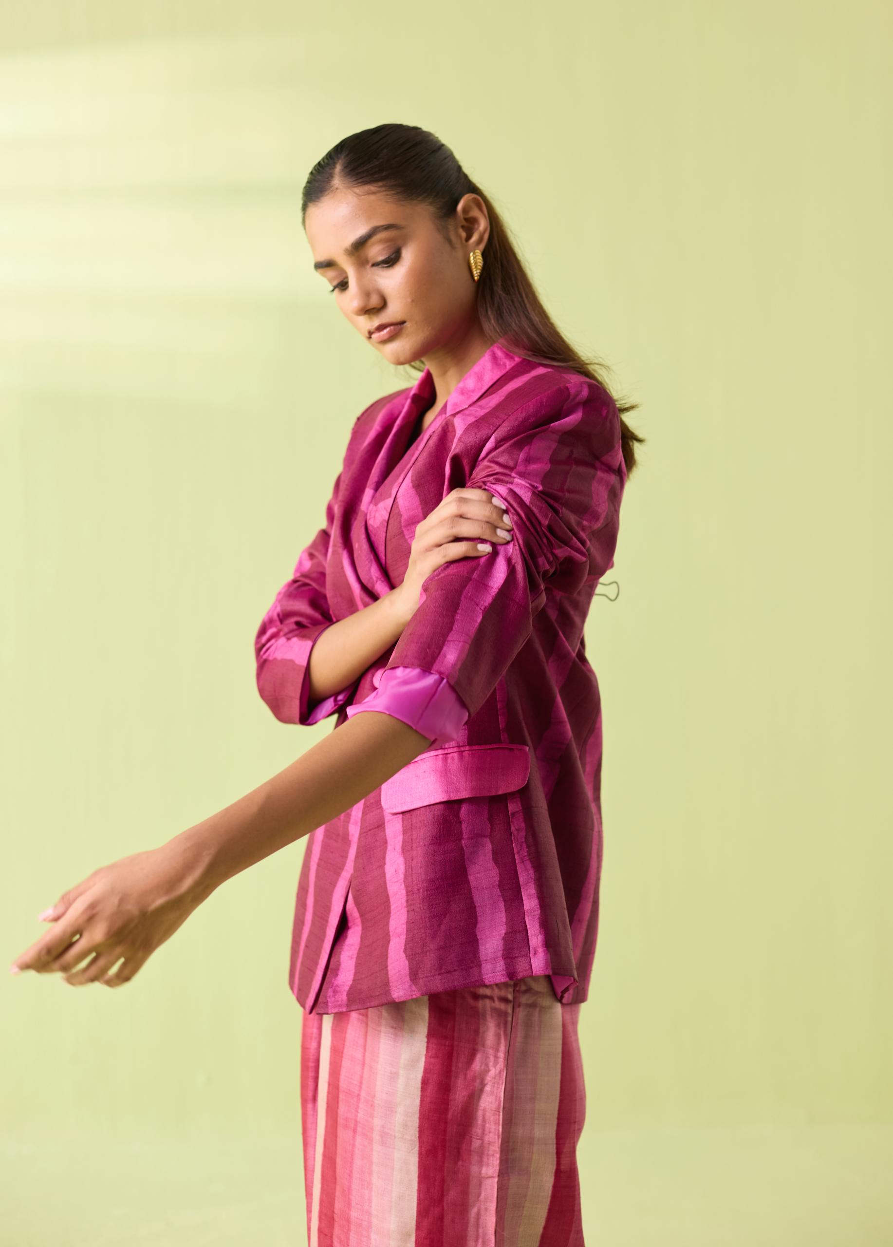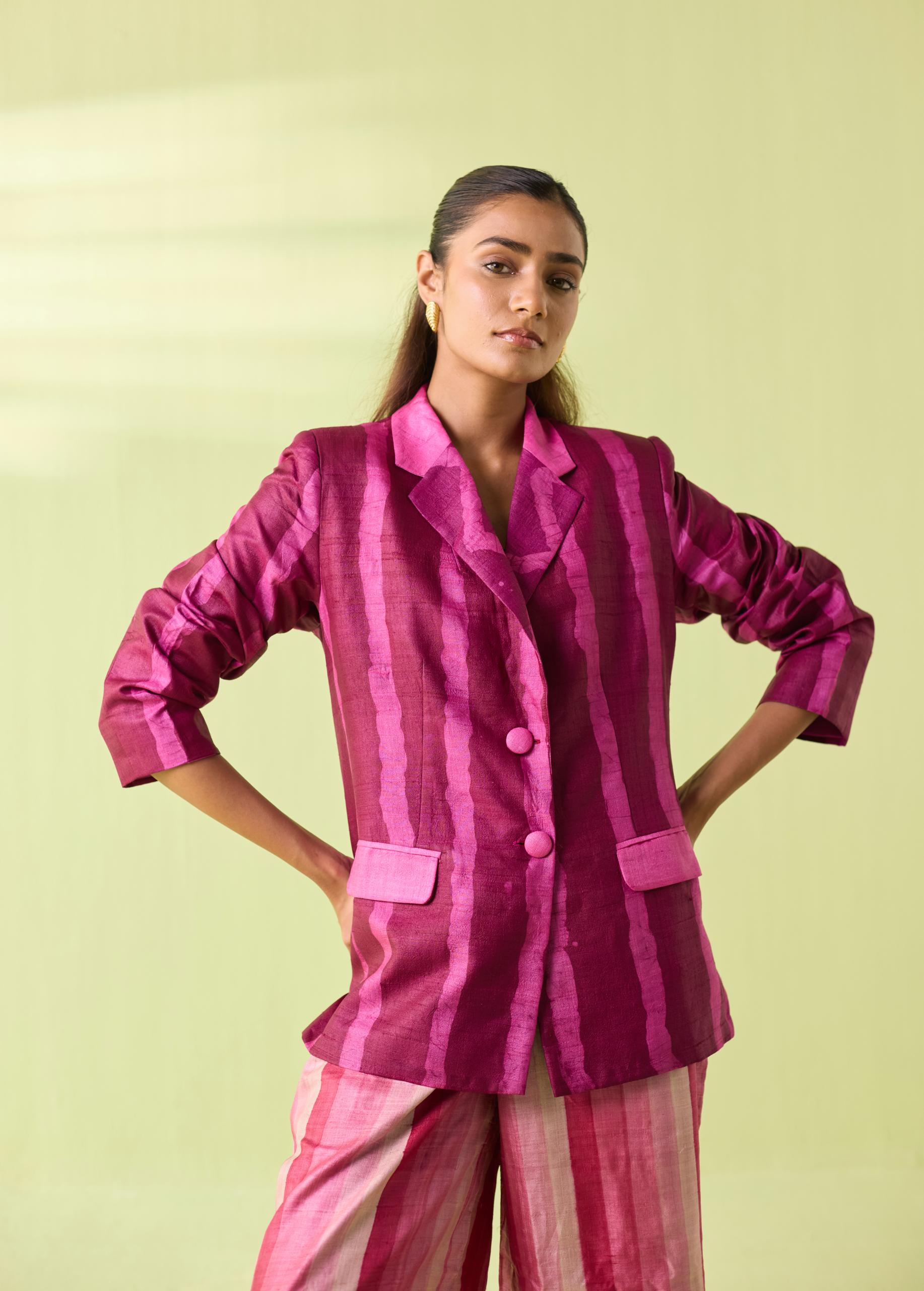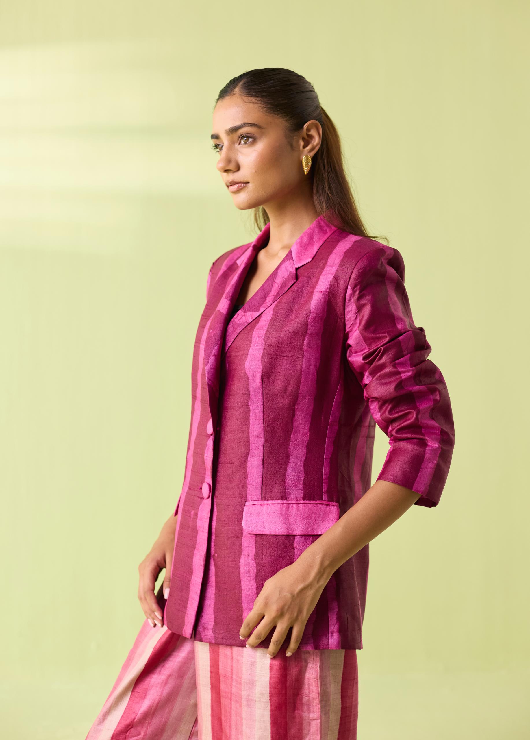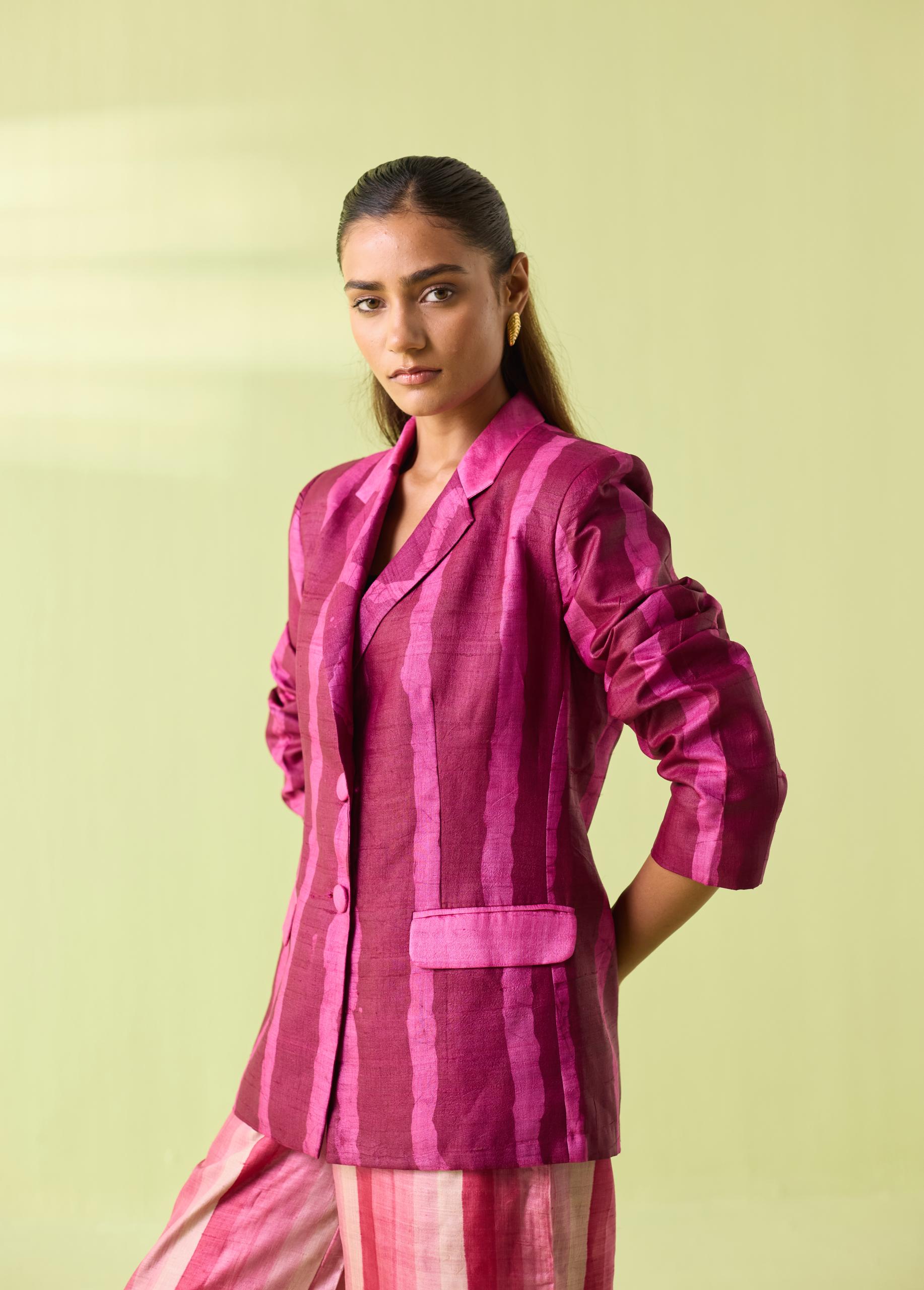 A striking blend of elegance and bold colour, this Rani Ombre Kosa Silk Jacket features rich pink tones transitioning in ombre stripes. Handwoven in pure Kosa silk, the jacket offers a structured yet fluid silhouette, making it perfect for statement layering. Finished with fabric-covered buttons and clean tailoring, it reflects the refined craftsmanship of Neeti S Sud.