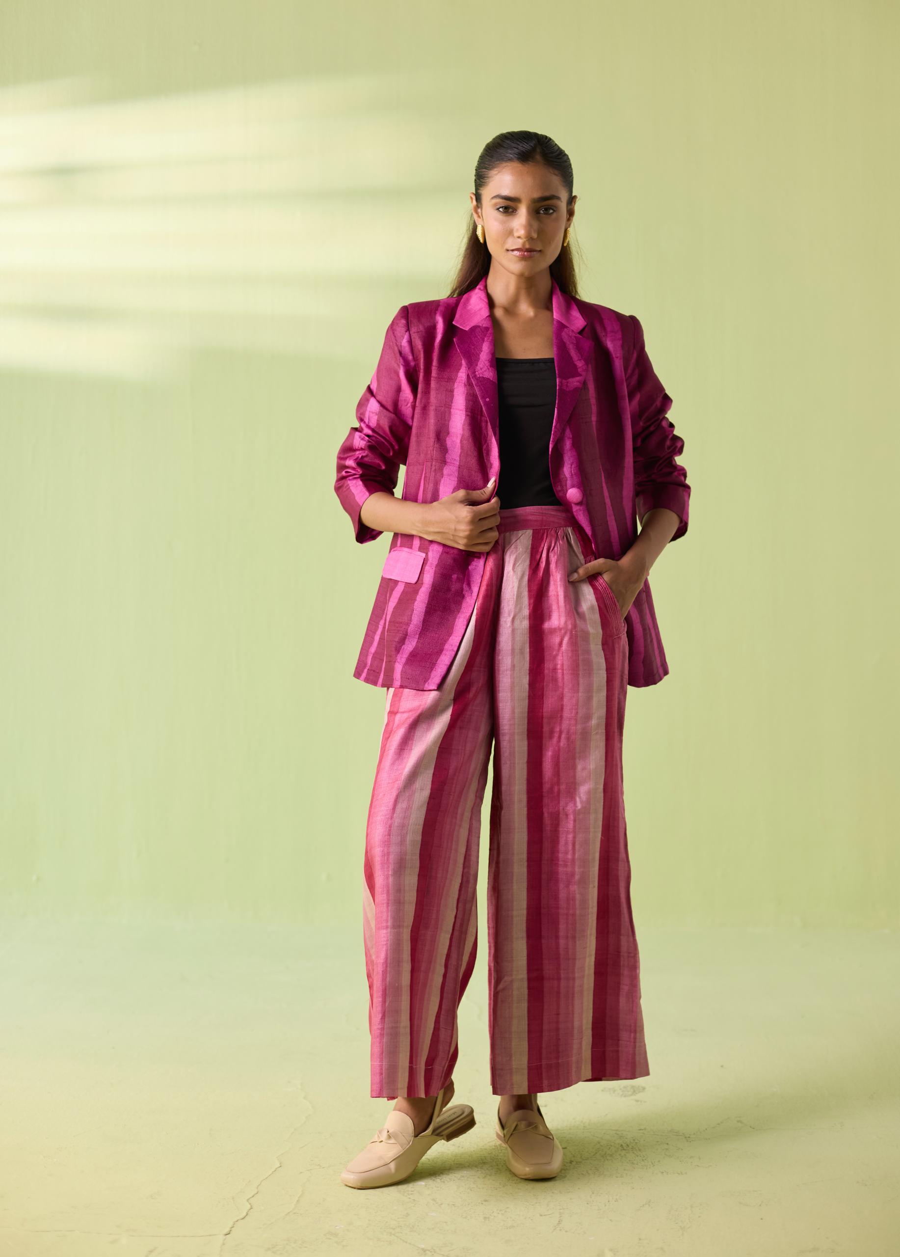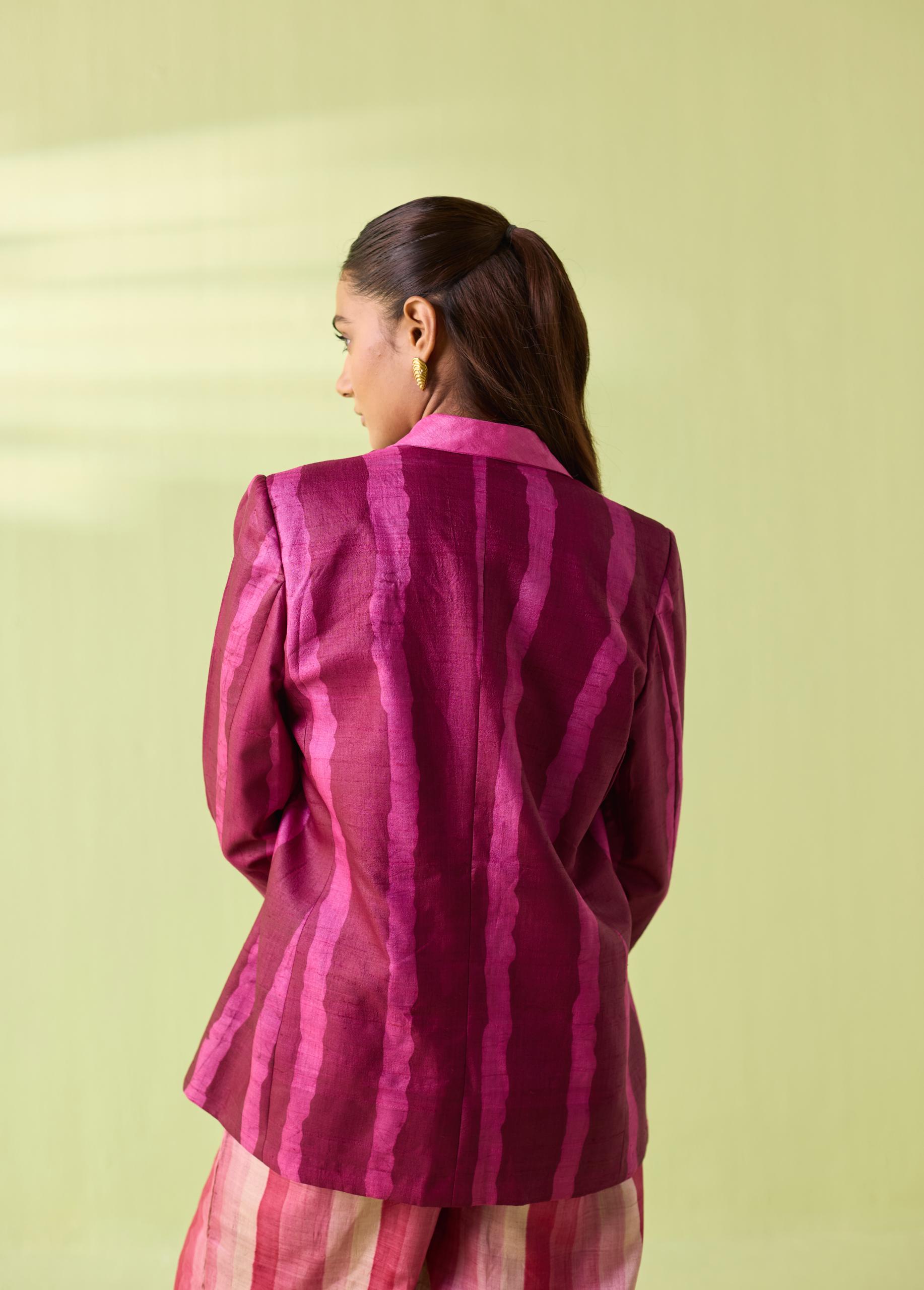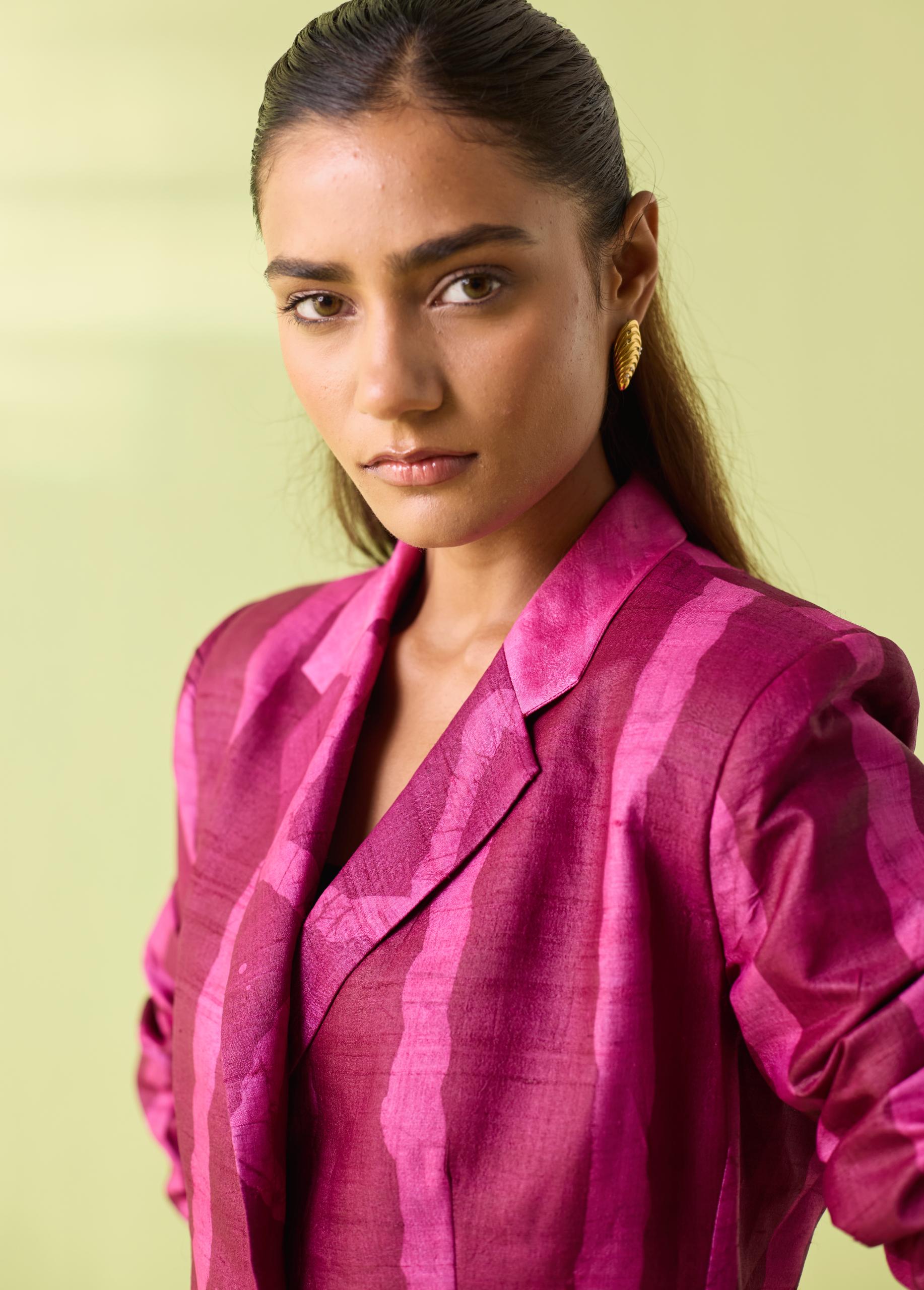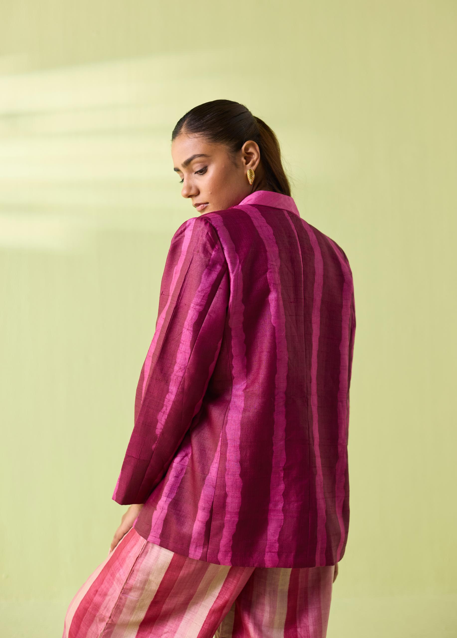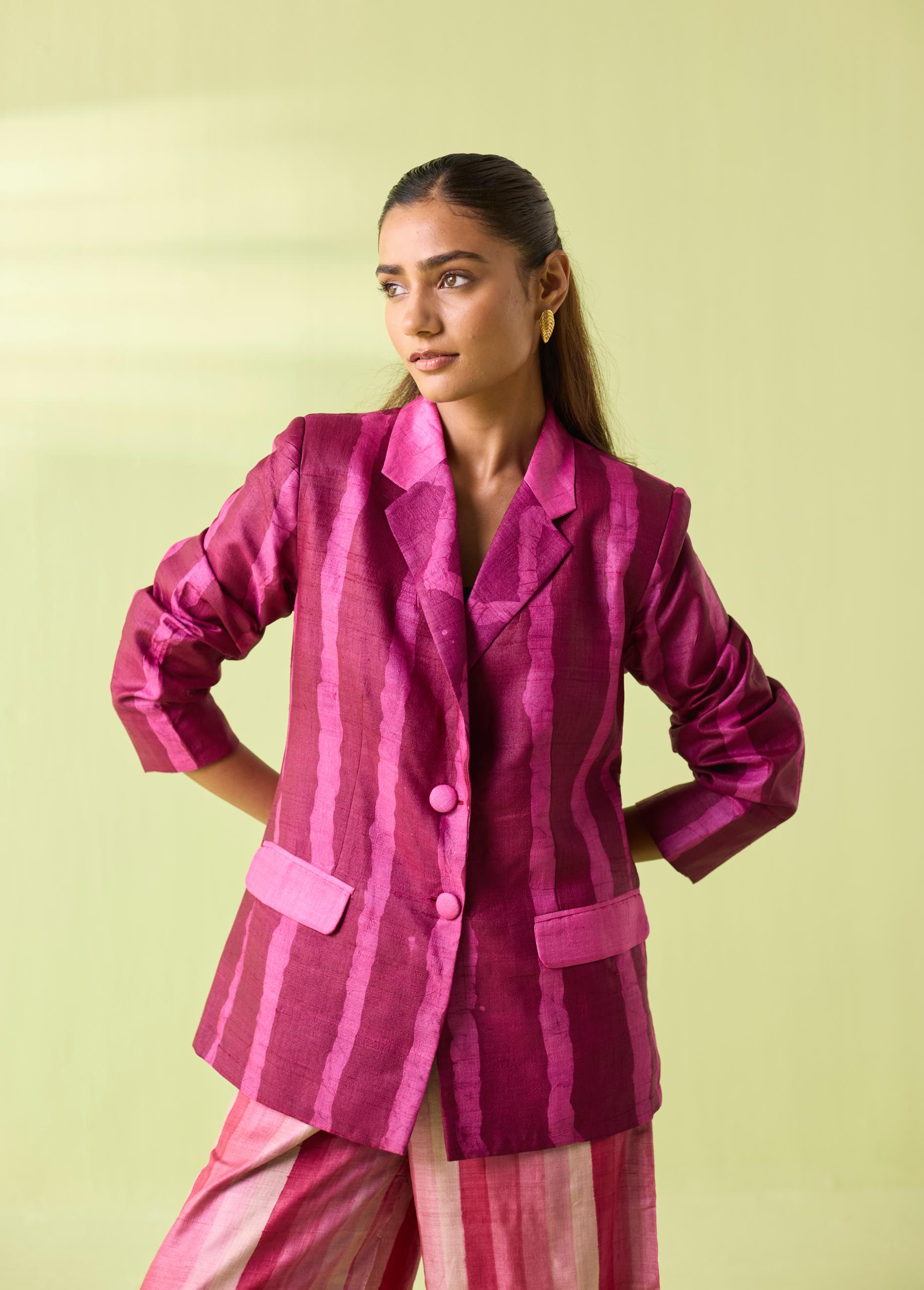 A striking blend of elegance and bold colour, this Rani Ombre Kosa Silk Jacket features rich pink tones transitioning in ombre stripes. Handwoven in pure Kosa silk, the jacket offers a structured yet fluid silhouette, making it perfect for statement layering. Finished with fabric-covered buttons and clean tailoring, it reflects the refined craftsmanship of Neeti S Sud.