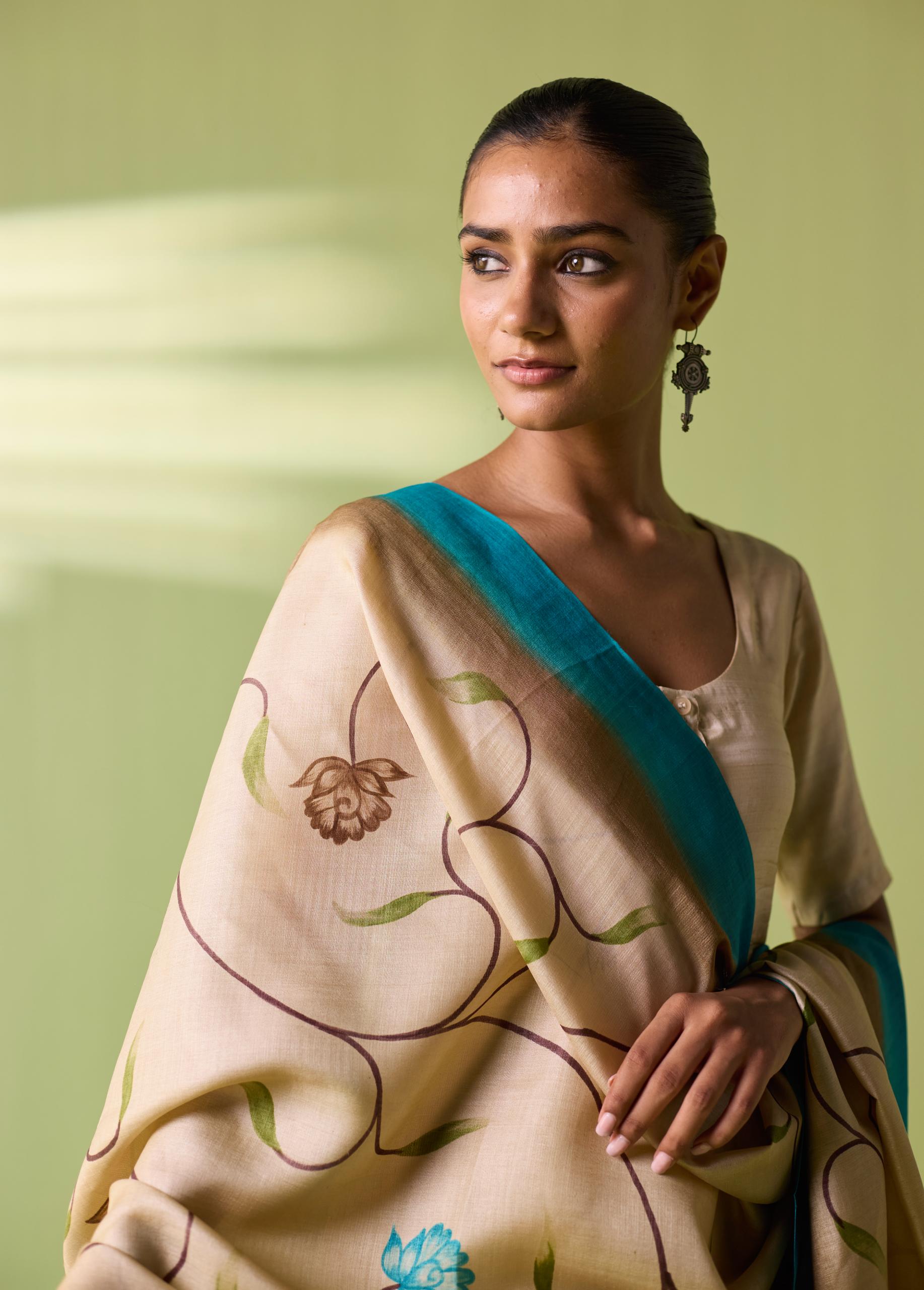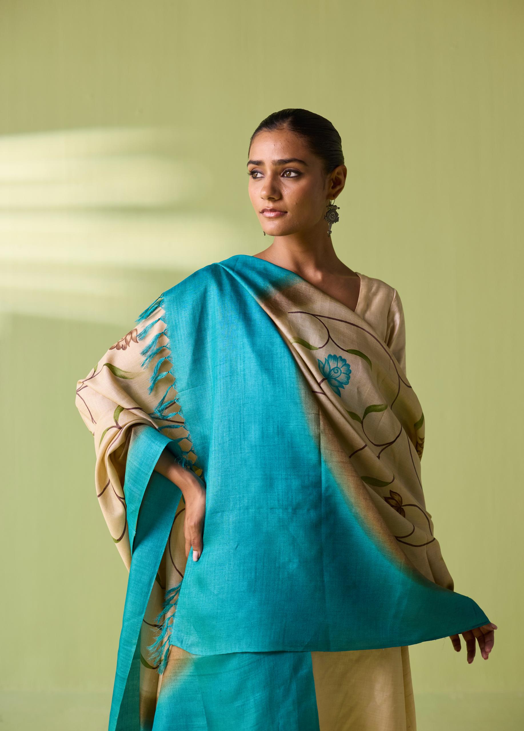 Graceful and artistic, the Turquoise Lotus Hand-Painted Kosa Silk Dupatta features beautifully hand-painted lotus blooms and delicate vines across a soft beige canvas, framed with a striking turquoise border. Crafted in pure Kosa Silk from Chhattisgarh, it offers a natural sheen, lightweight drape, and timeless elegance. Perfect for pairing with solid kurtas or festive ensembles, this dupatta adds a serene, heritage-rich charm to any look.