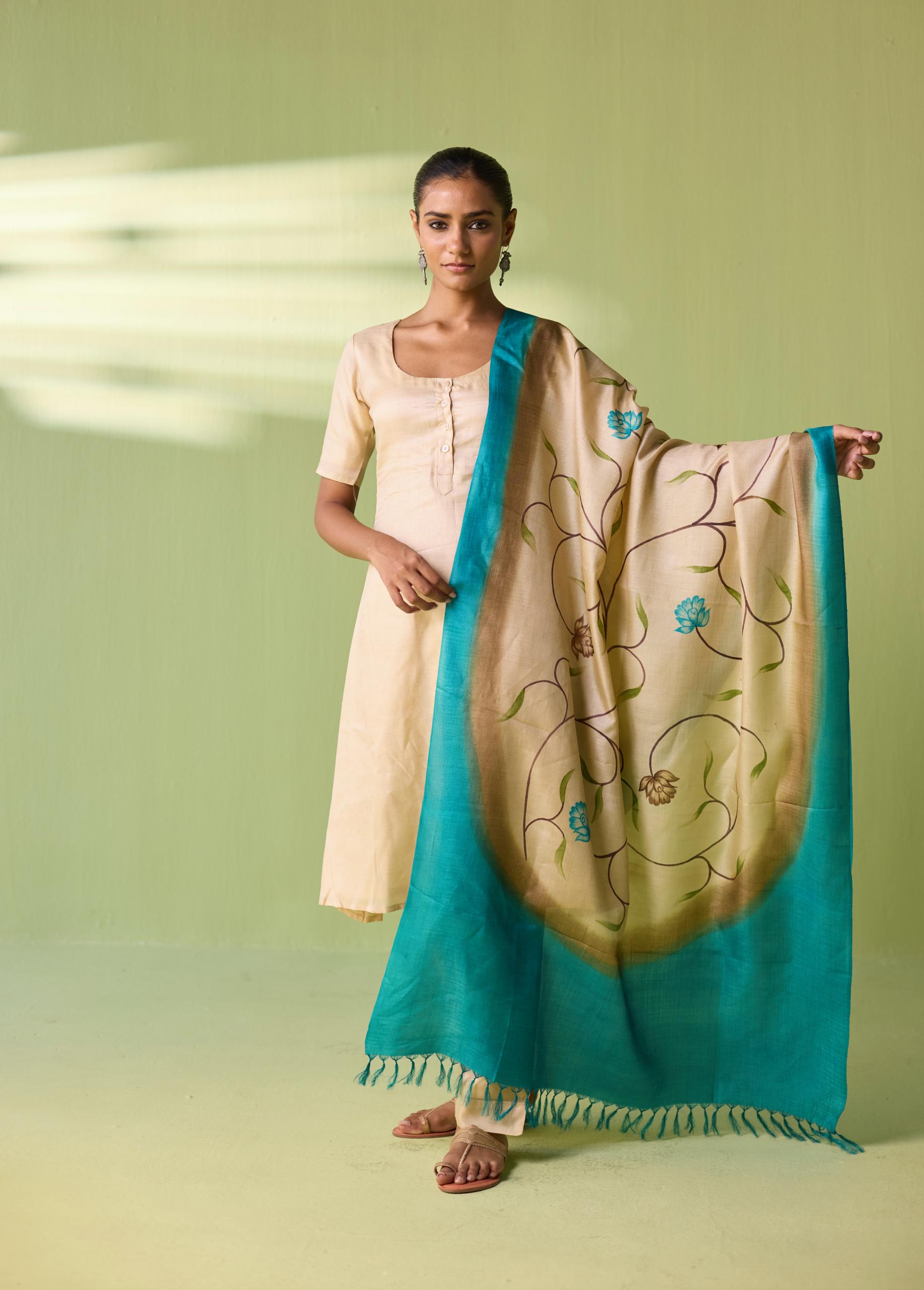 Turquoise Lotus Hand-Painted Kosa Silk Dupatta