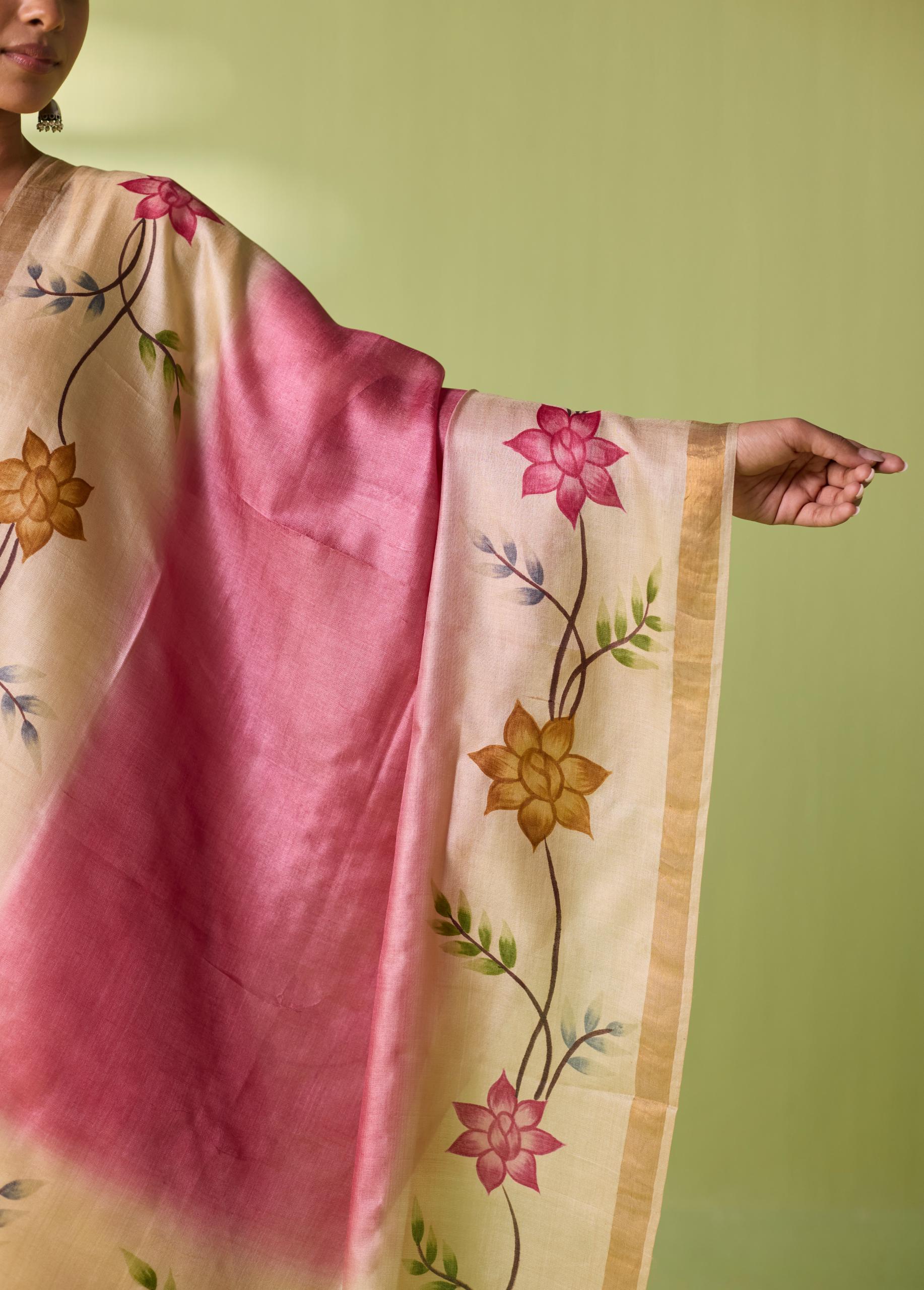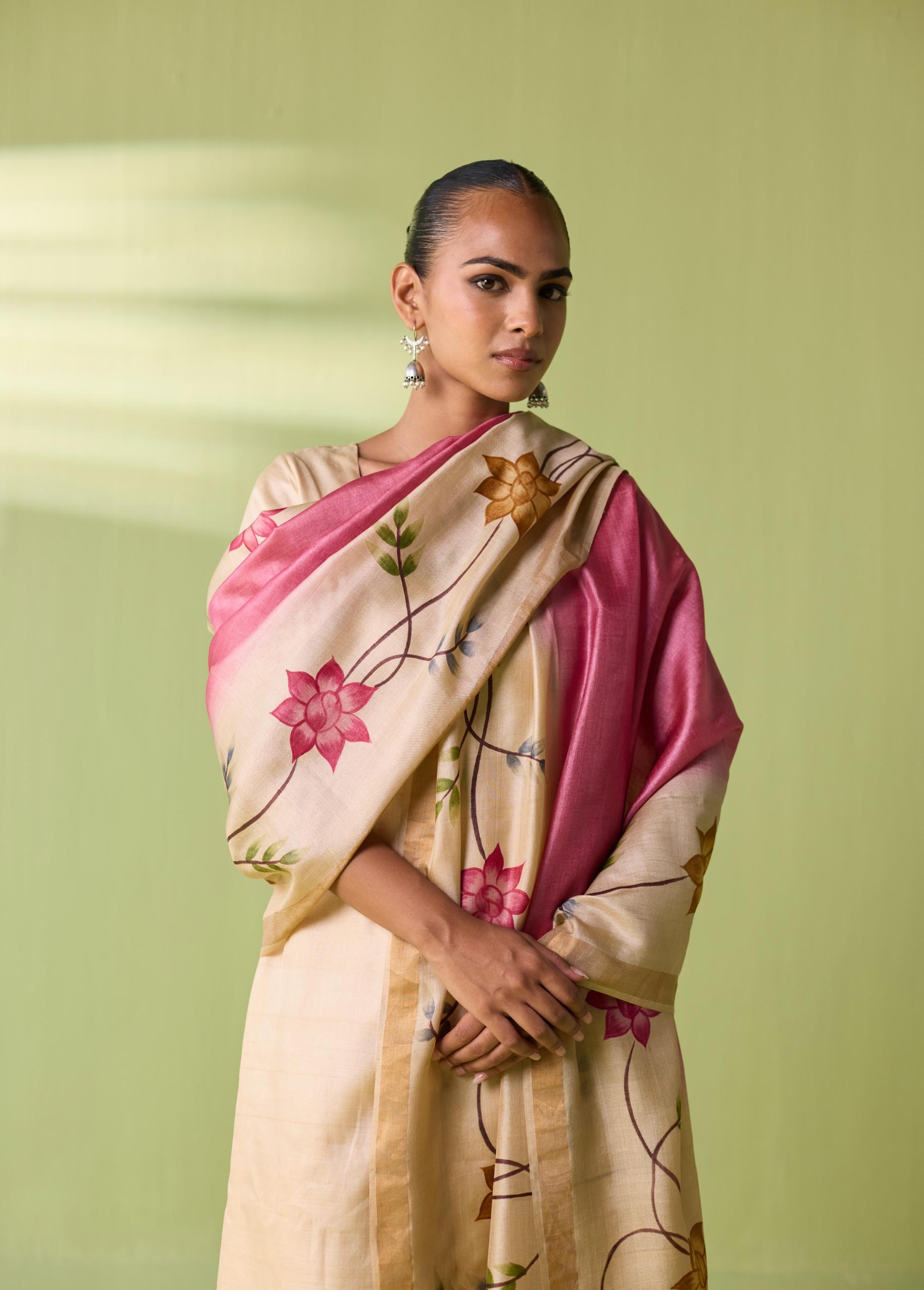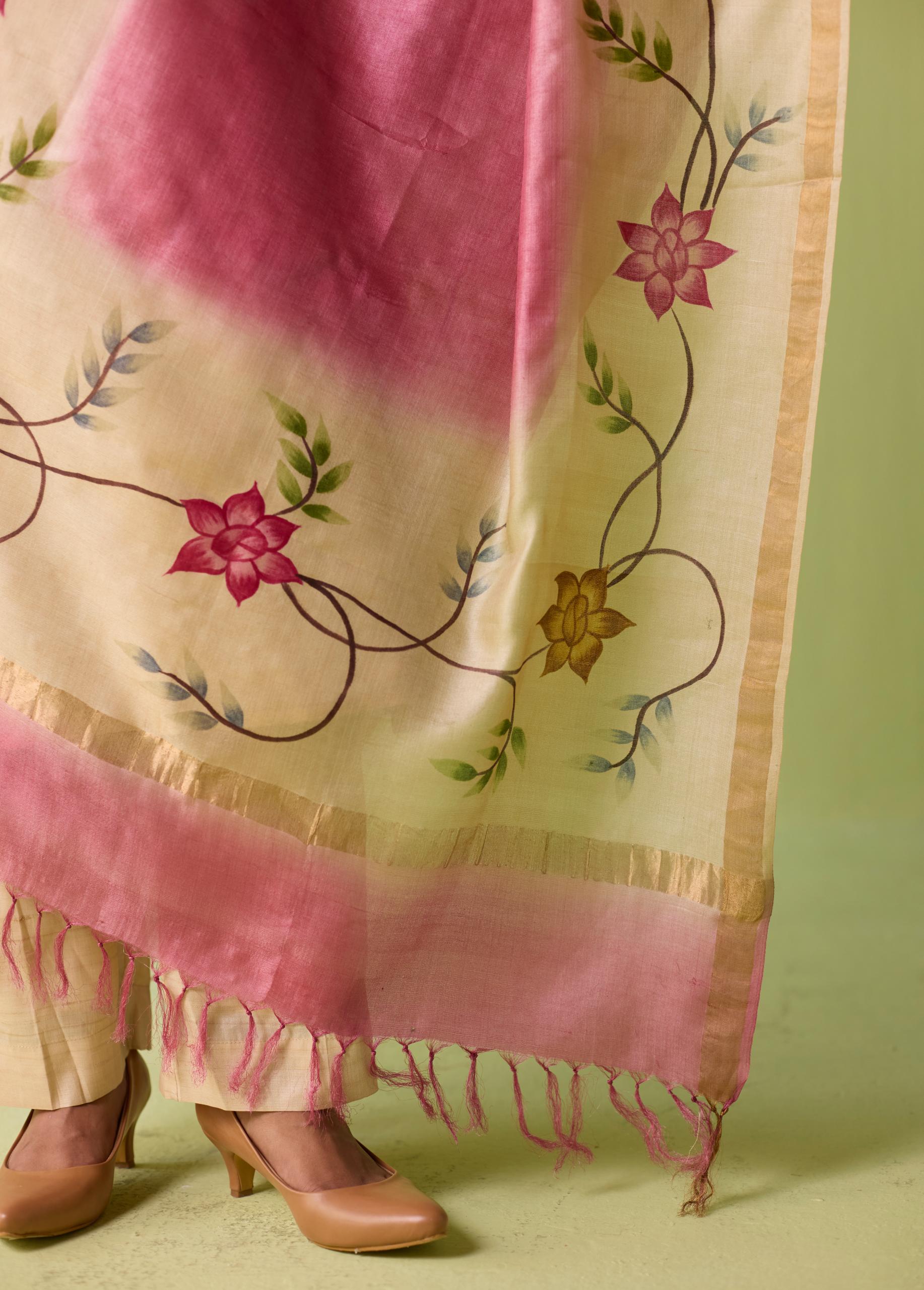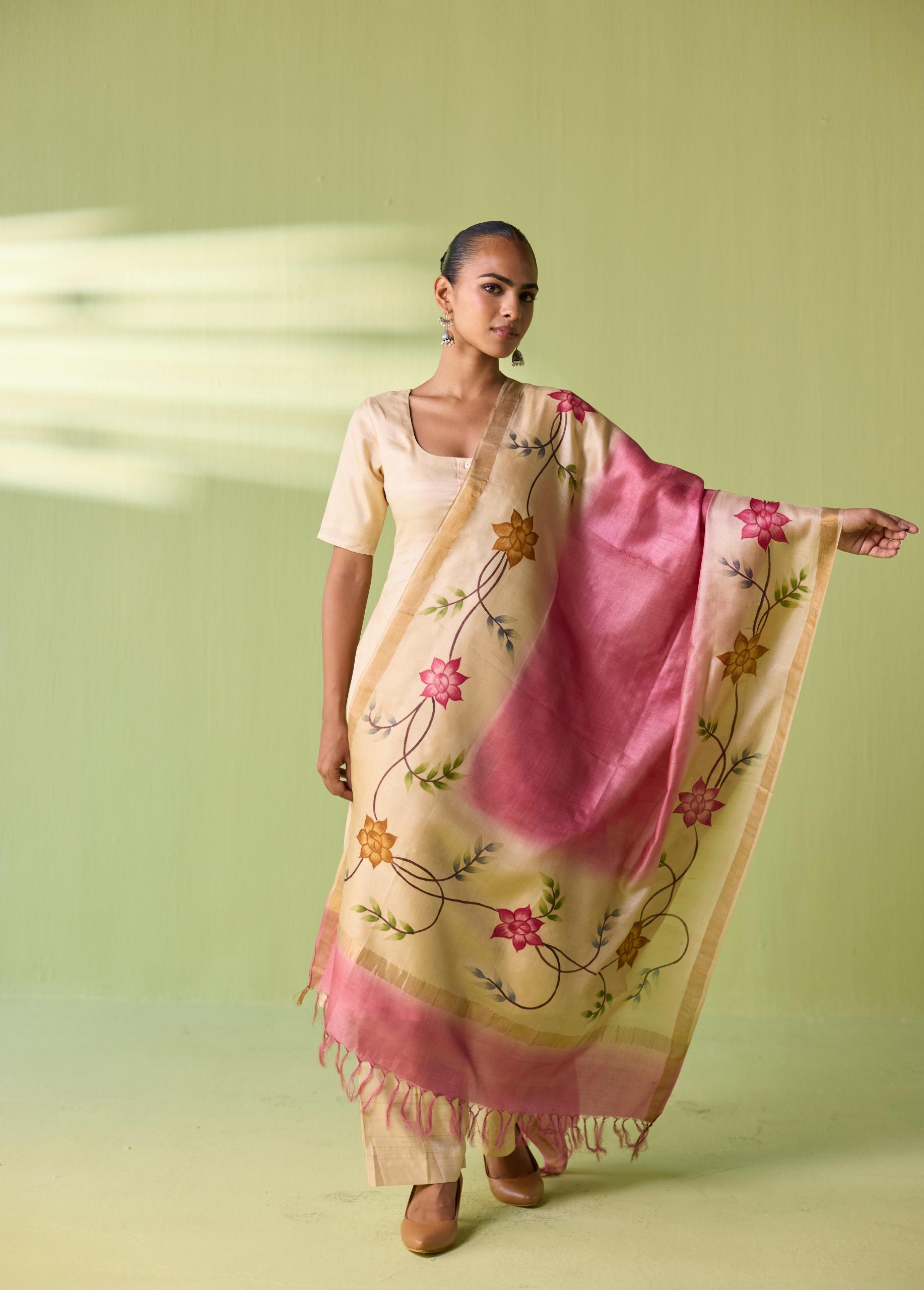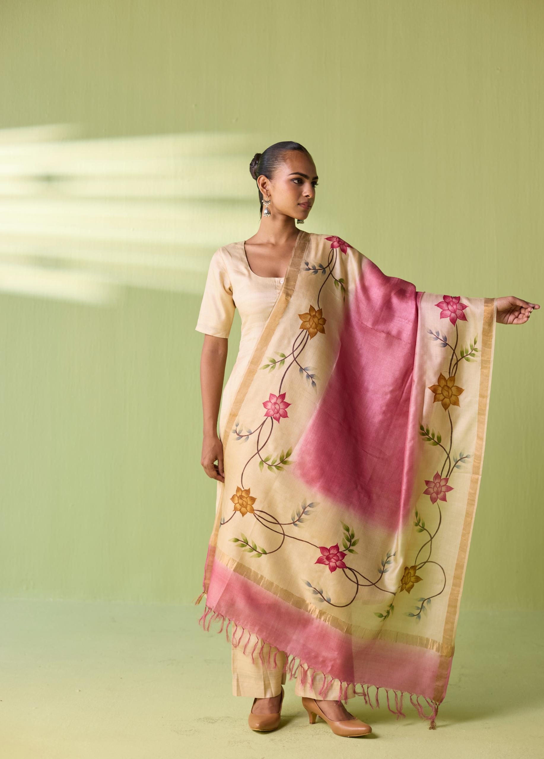 Soft, romantic, and entirely hand-crafted, the Gulzar Blossom Hand-Painted Kosa Silk Dupatta features beautifully painted floral vines in shades of pink and mustard over a gentle ivory base. The subtle ombré wash blends elegantly into rose pink, creating a dreamy, feminine look. Crafted in pure Kosa Silk from Chhattisgarh, this dupatta drapes with natural sheen and effortless grace. Perfect for pairing with solid kurtas, festive outfits, or elegant daywear—an exquisite Neeti S Sud keepsake celebrating art and heritage.
