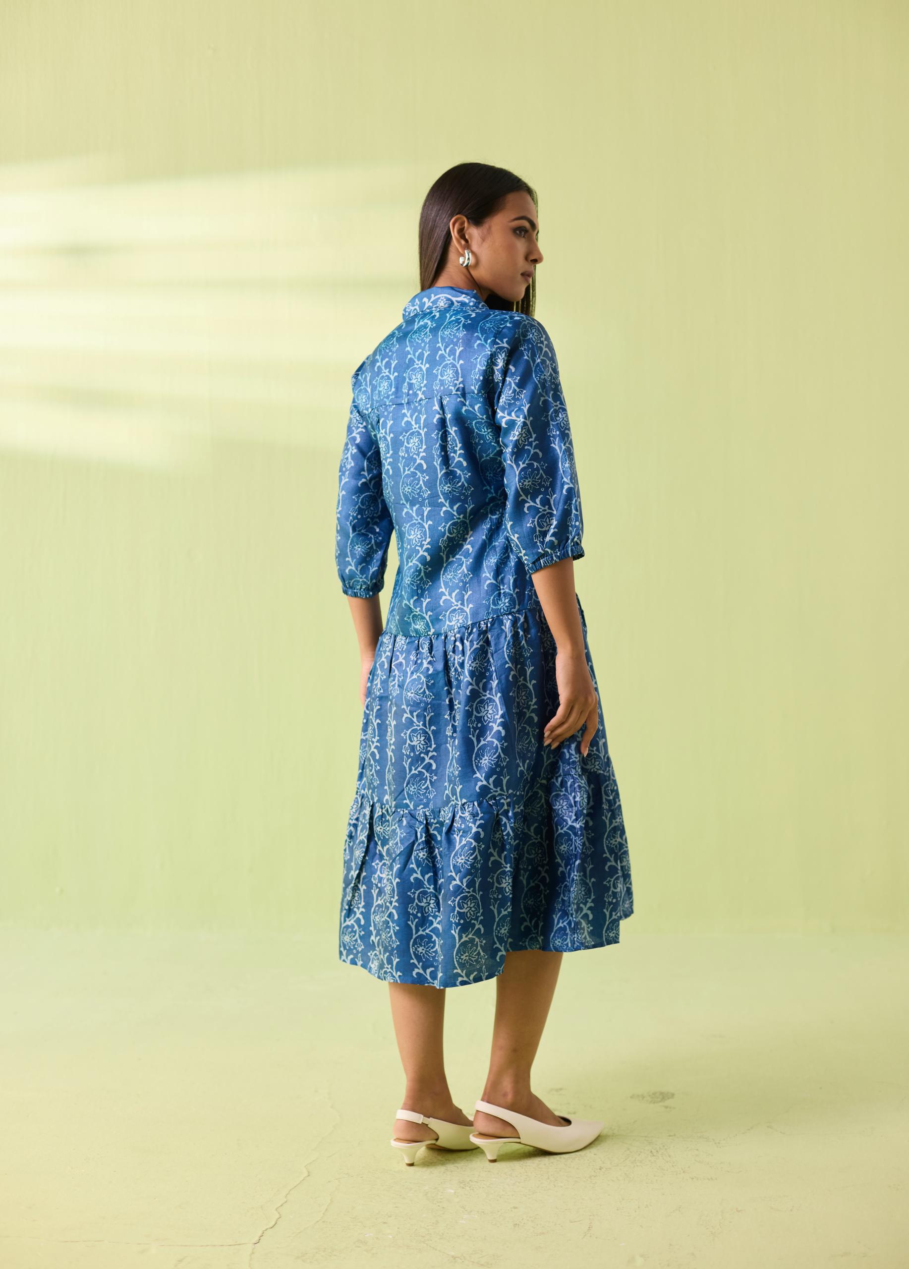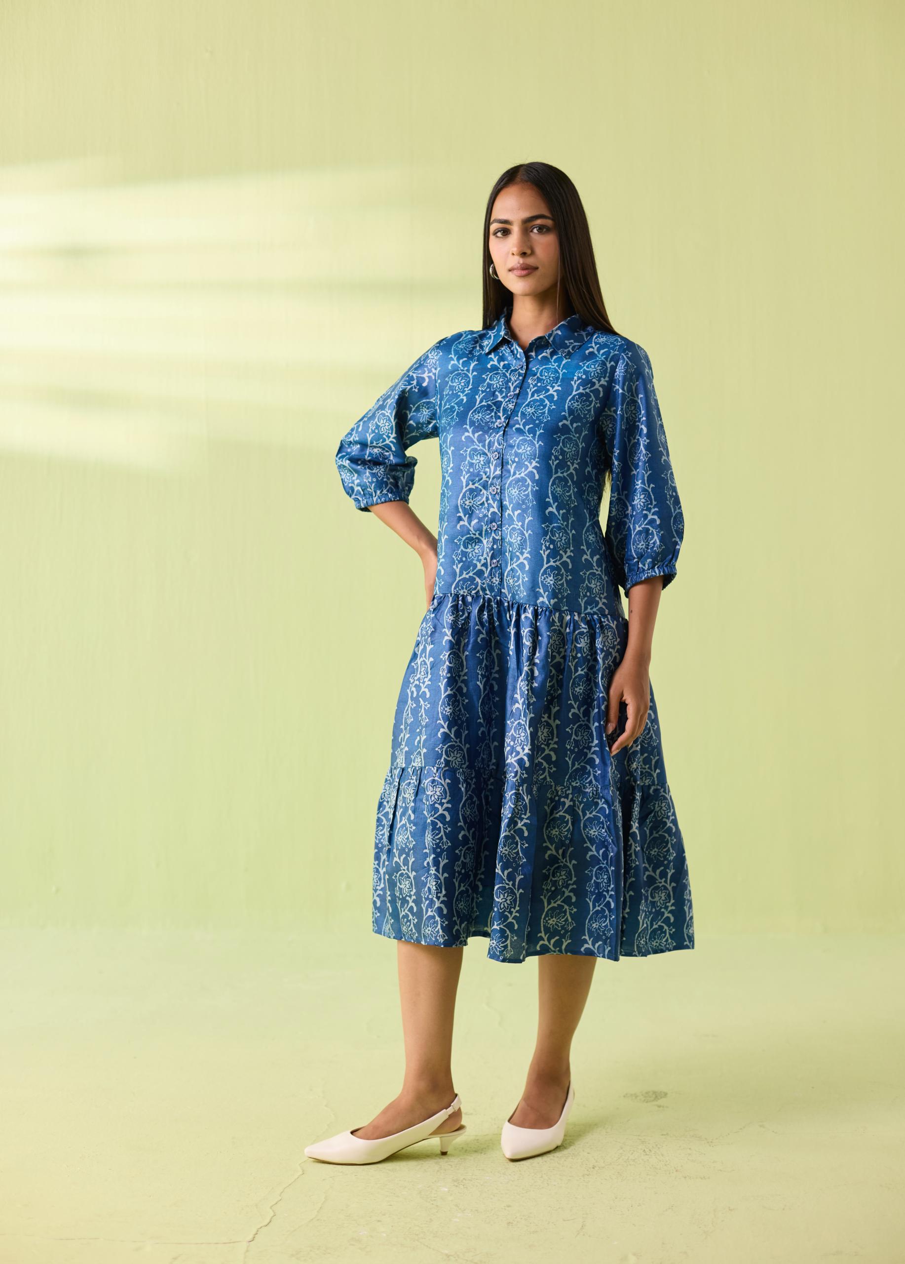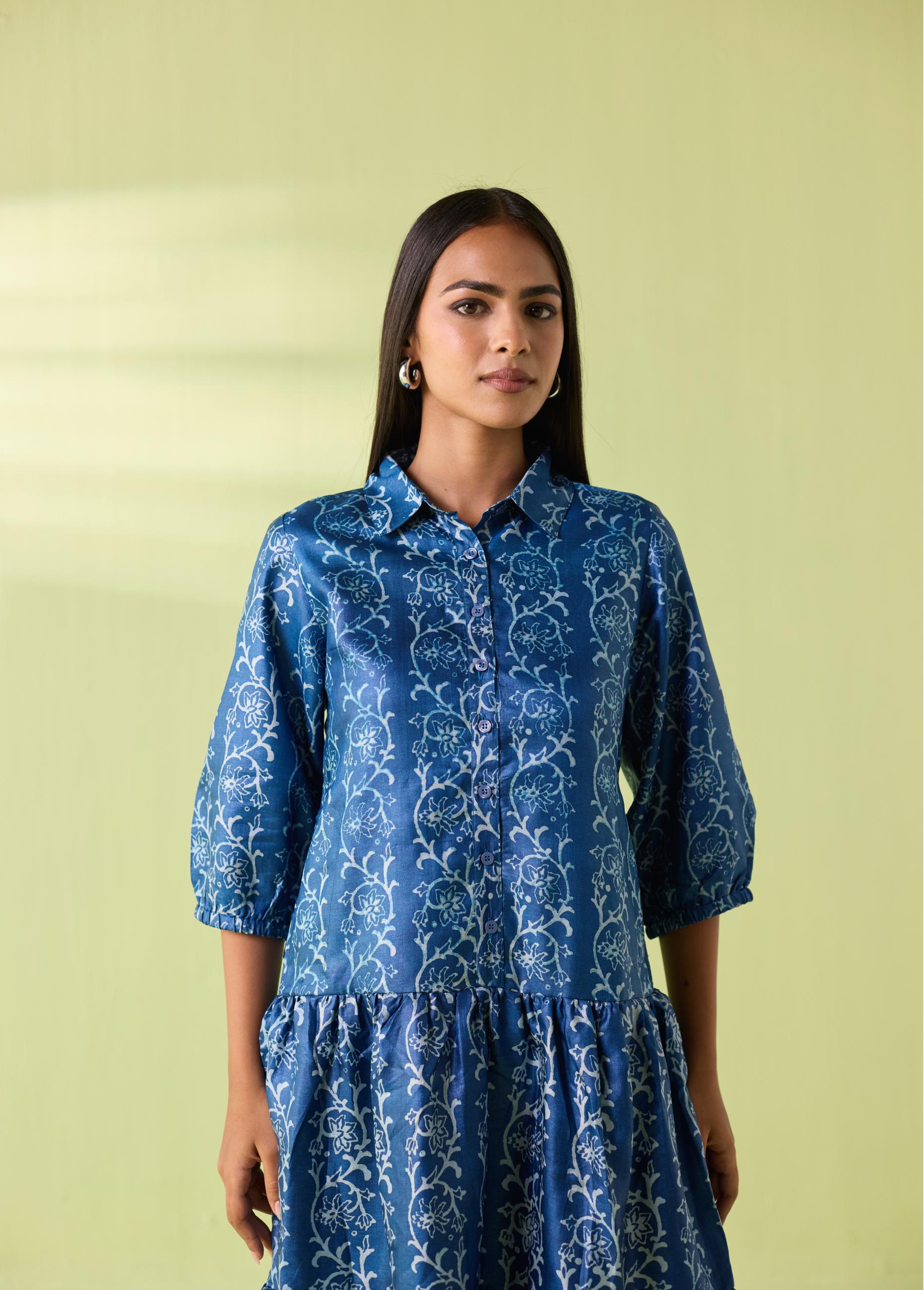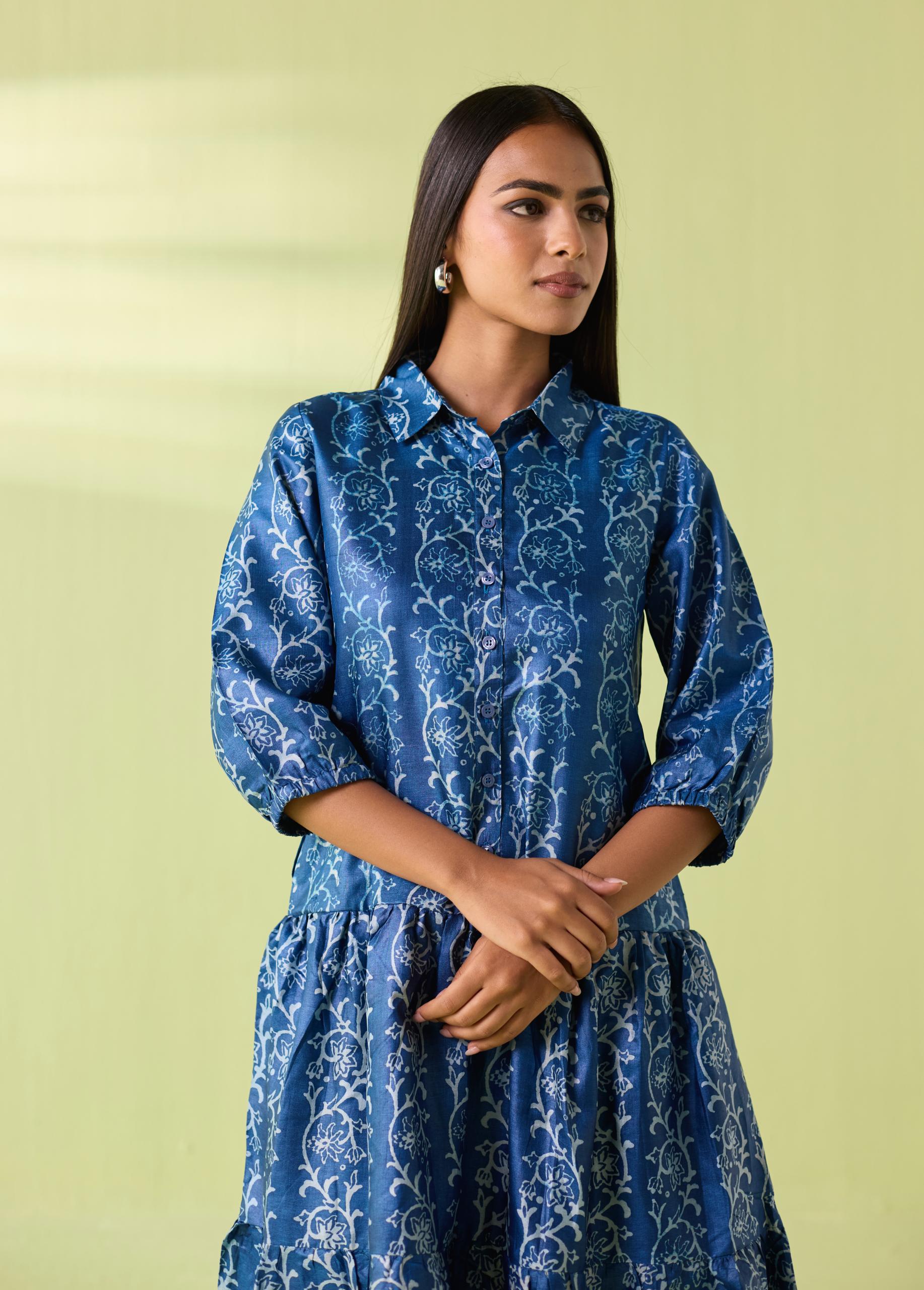 Azure Vine Kosa Silk Tiered Shirt Dress