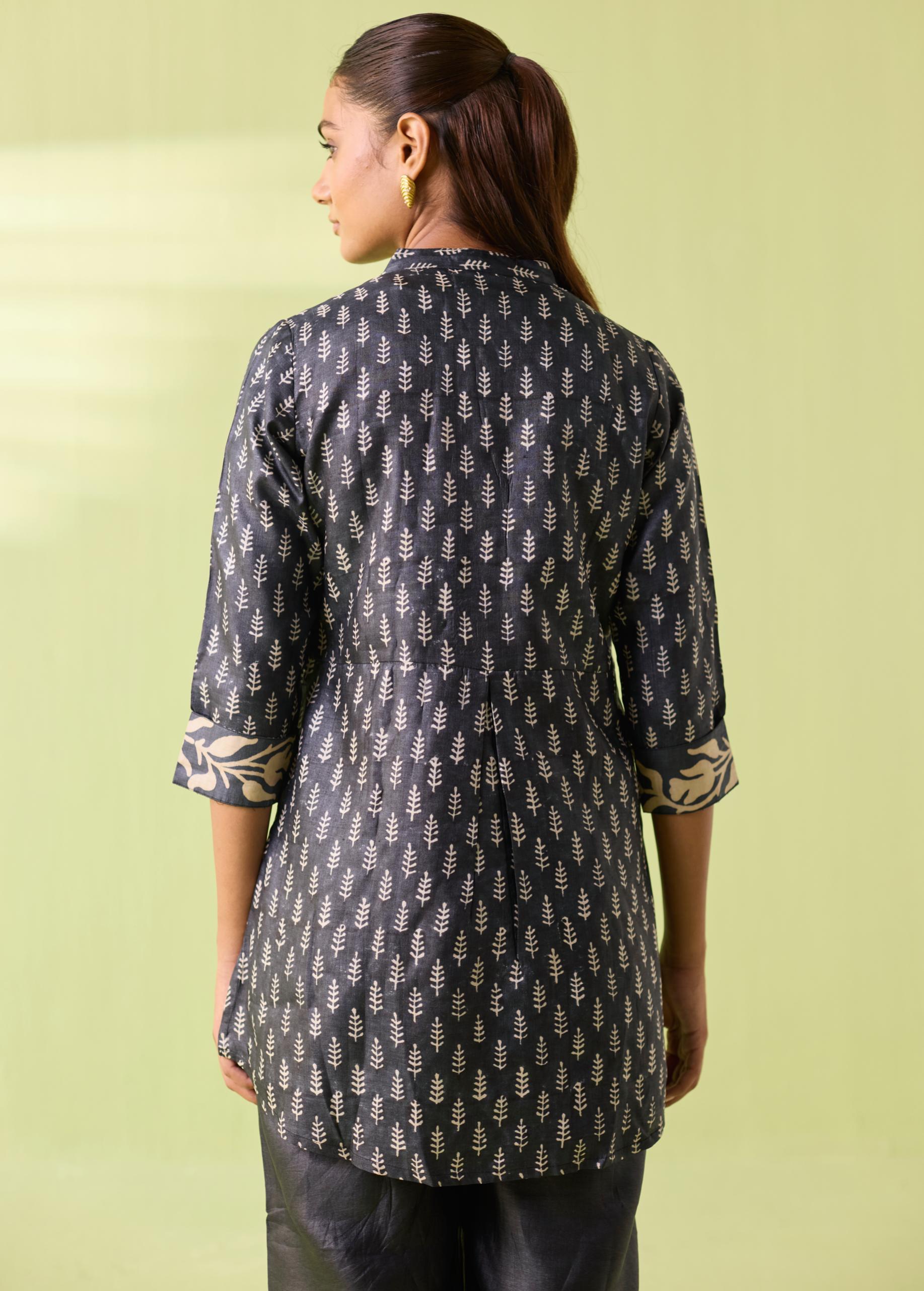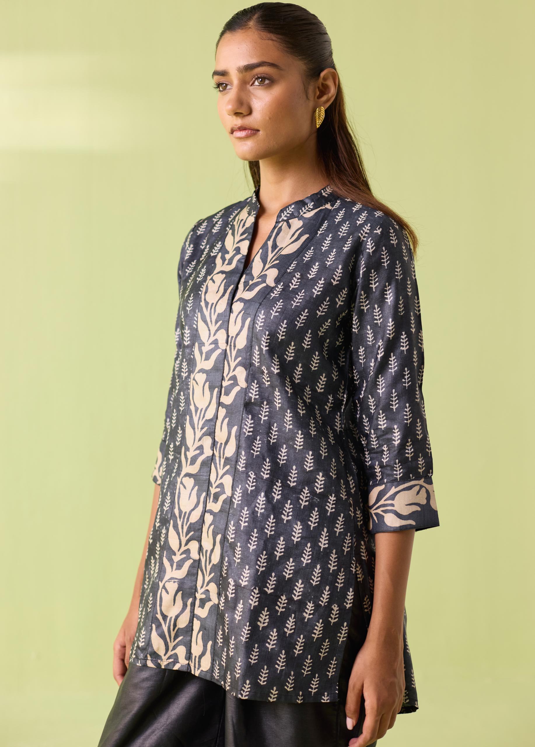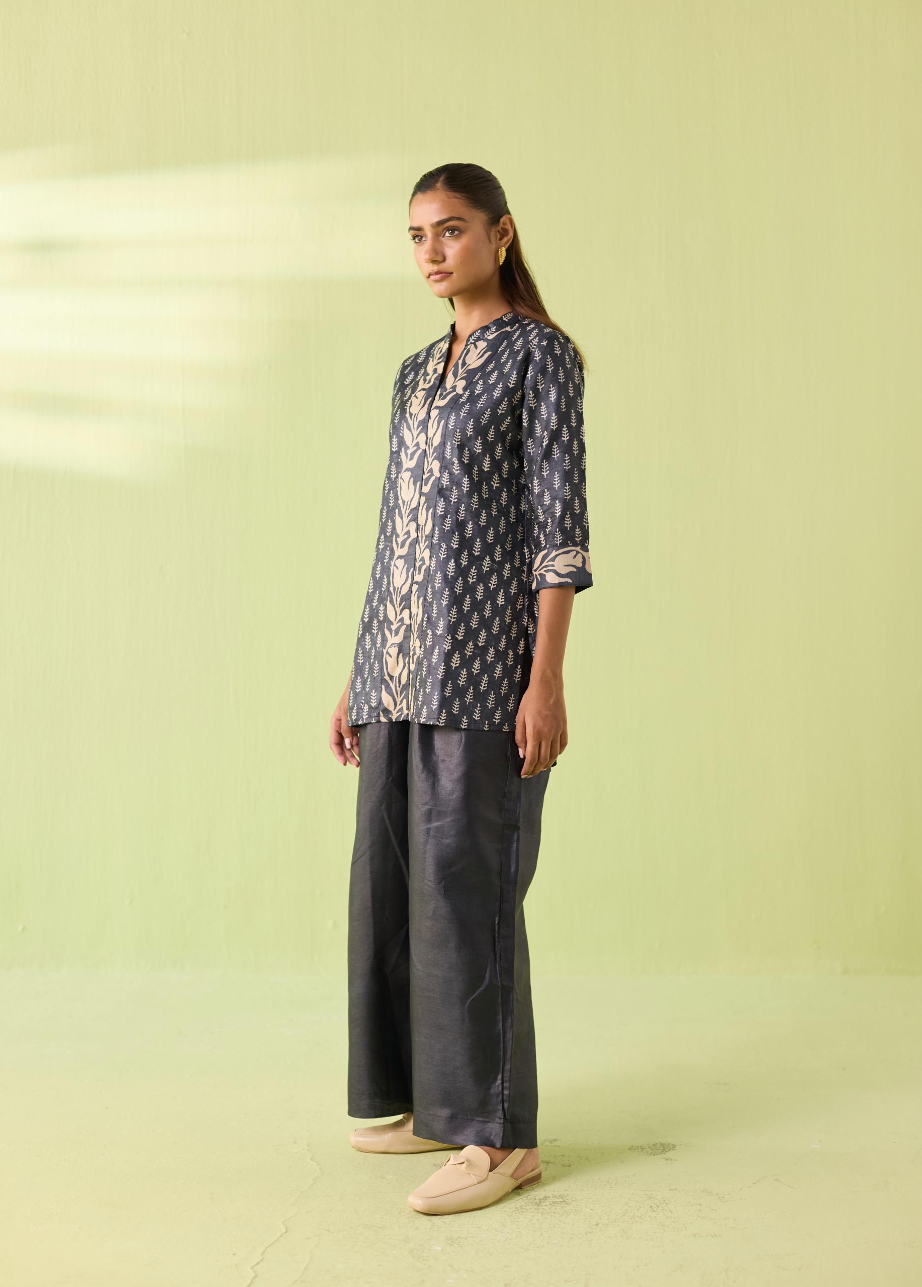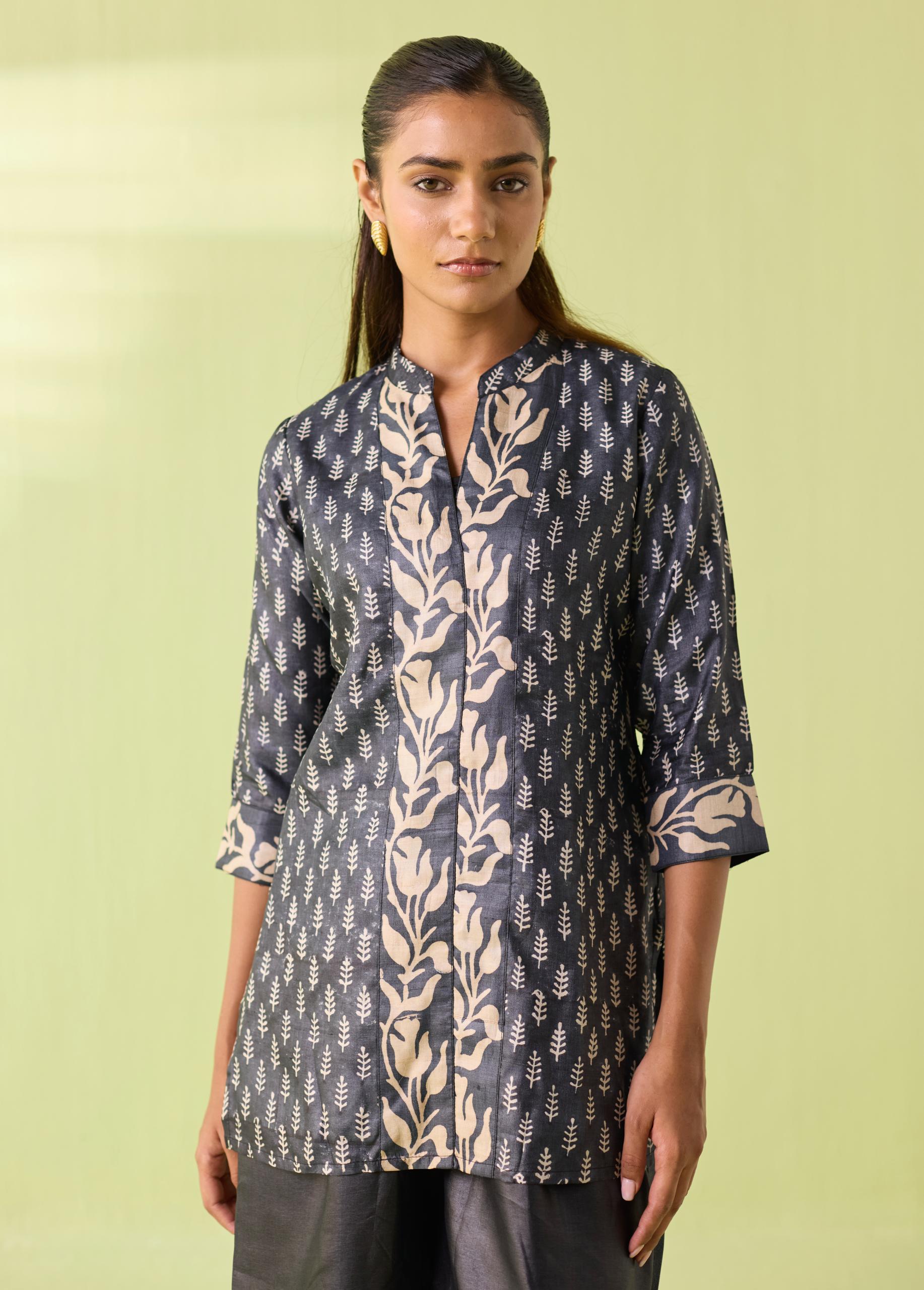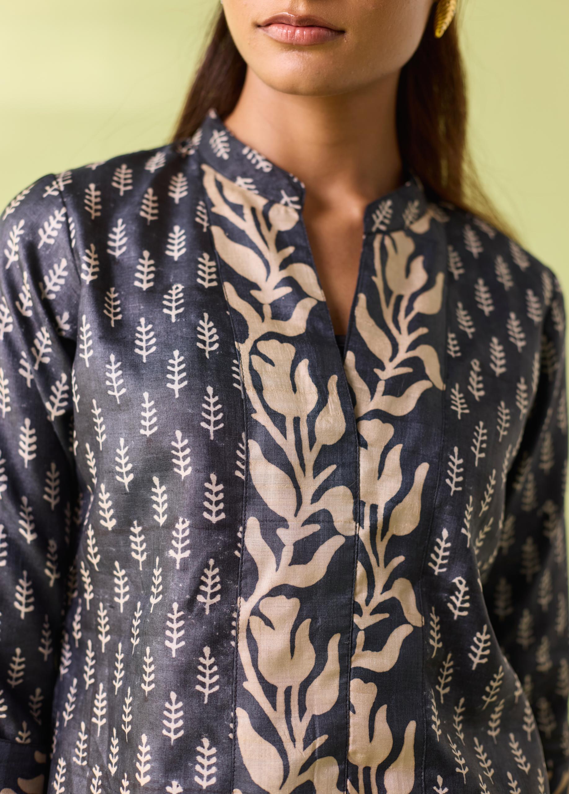 Crafted in luxurious Kosa Silk from Chhattisgarh, the Midnight Vine Kosa Silk Shirt features an elegant navy-charcoal base adorned with intricate vine motifs in soft beige. The mandarin neckline and three-quarter sleeves add a contemporary touch, making it a versatile piece you can pair with trousers, palazzos, or denims. Lightweight, artisanal, and effortlessly sophisticated—perfect for refined everyday wear or intimate evening gatherings.