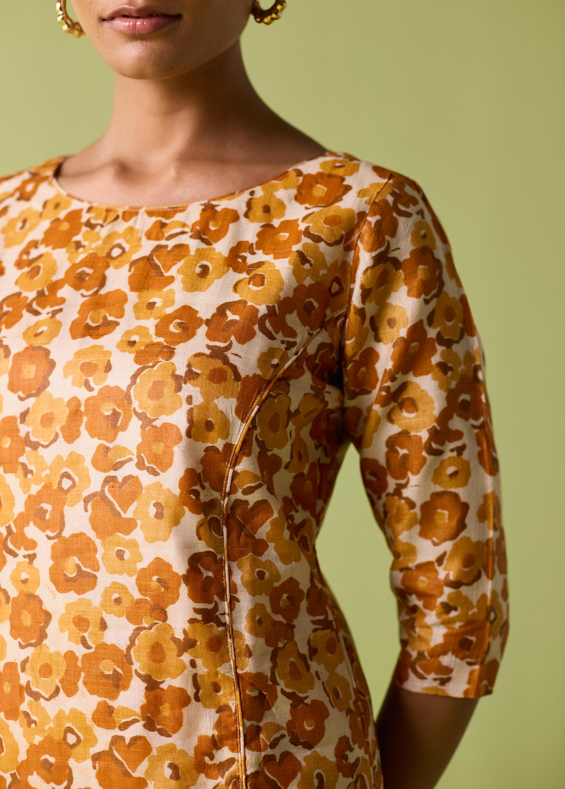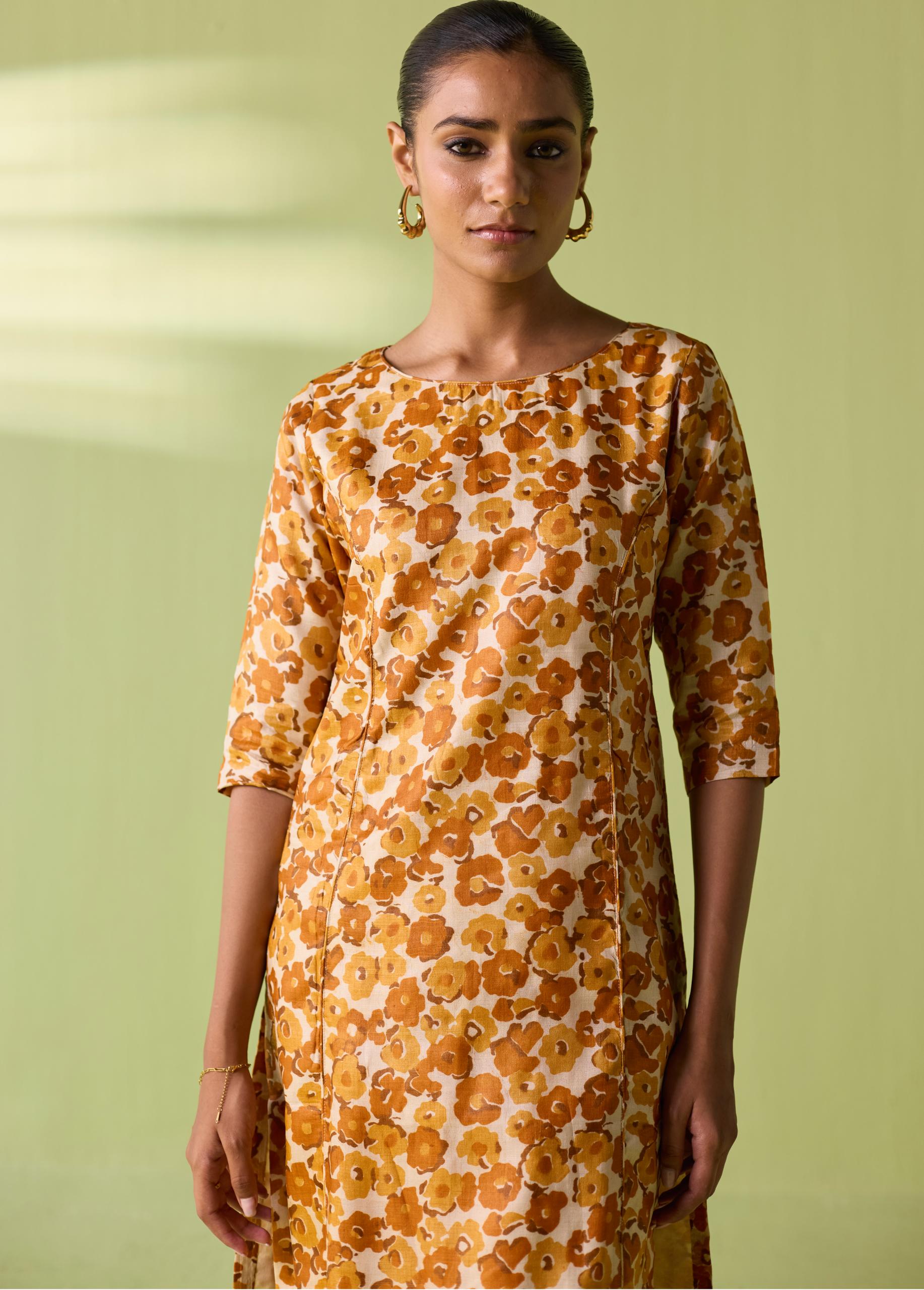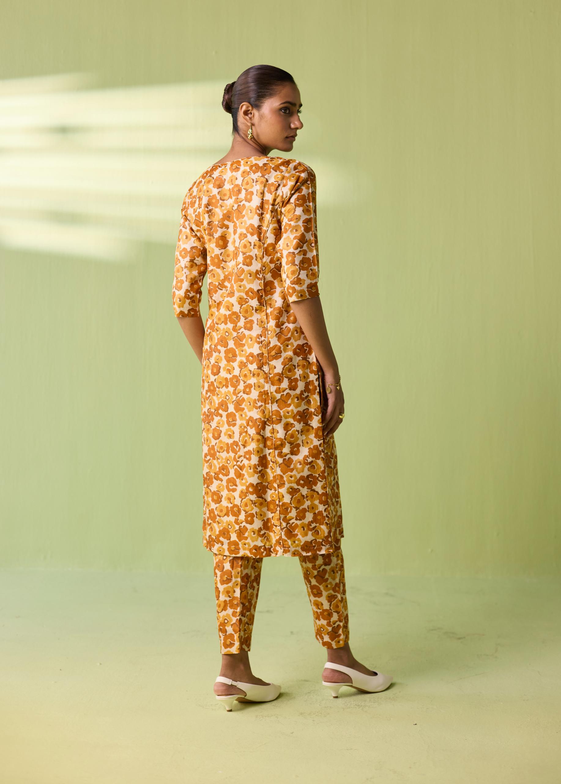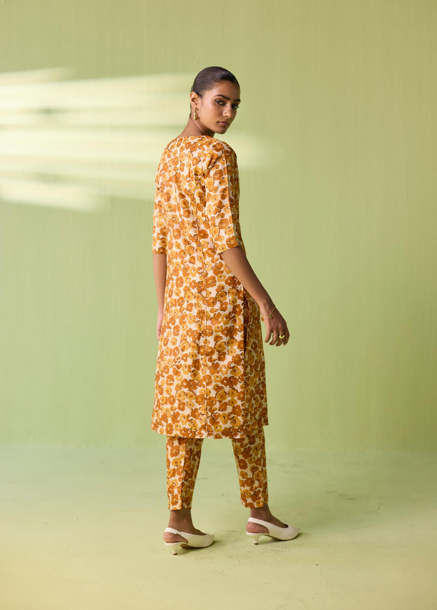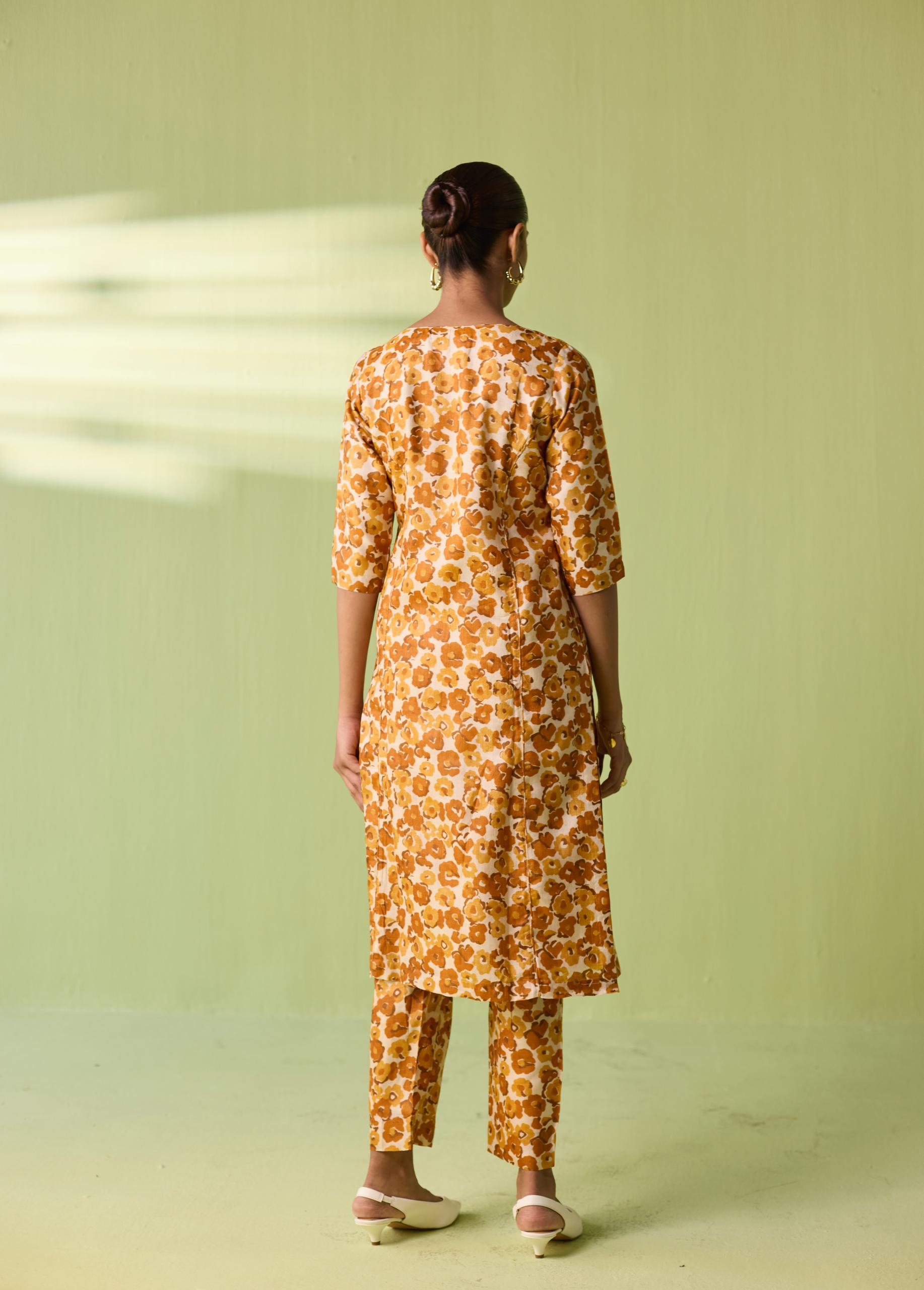 Celebrate the richness of Chhattisgarh’s heritage with the Saffron Meadow Kosa Silk Printed Suit Set. Crafted in authentic Kosa Silk, this lightweight and naturally lustrous ensemble features an all-over floral print in warm saffron and honey tones. The straight kurta paired with coordinated trousers creates a sleek, contemporary silhouette—perfect for festive brunches, intimate gatherings, or elegant everyday dressing. A timeless Neeti S Sud piece that beautifully blends comfort, craft, and artistry.